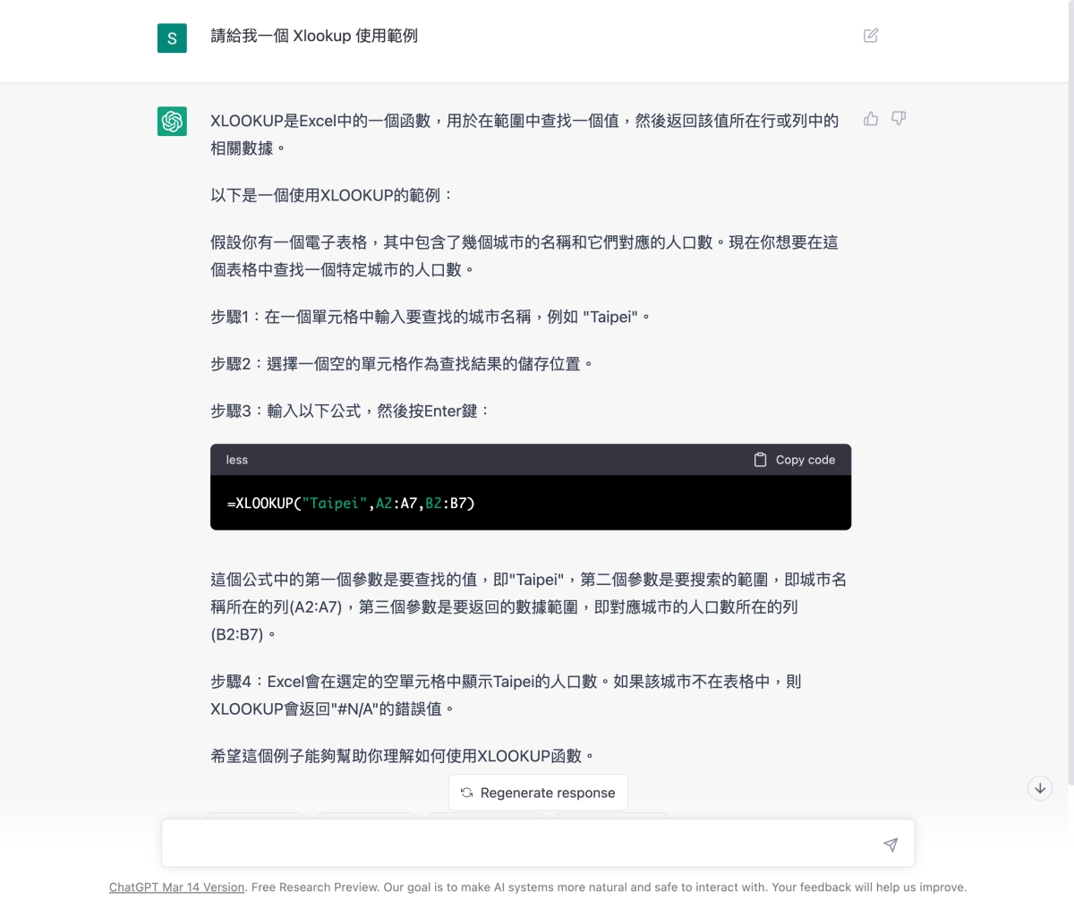 比如我複製到照他說到的,是 A2~B7 的範圍,然後在 C1 填入公式,不過有趣的是,他叫我們可以在 B1 填入要搜尋的城市名稱,就能比對資料,但 B1 不是已經放人口數這個標題列了嗎?這時察覺不對,就可以再反問一下 ChatGPT。