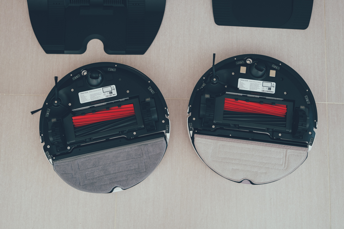 底部同樣採用雙主刷以及聲波震動拖地的設計,而左邊的 S8 Pro Ultra 因為充電金屬點在前方,所以下方也沒有配置。