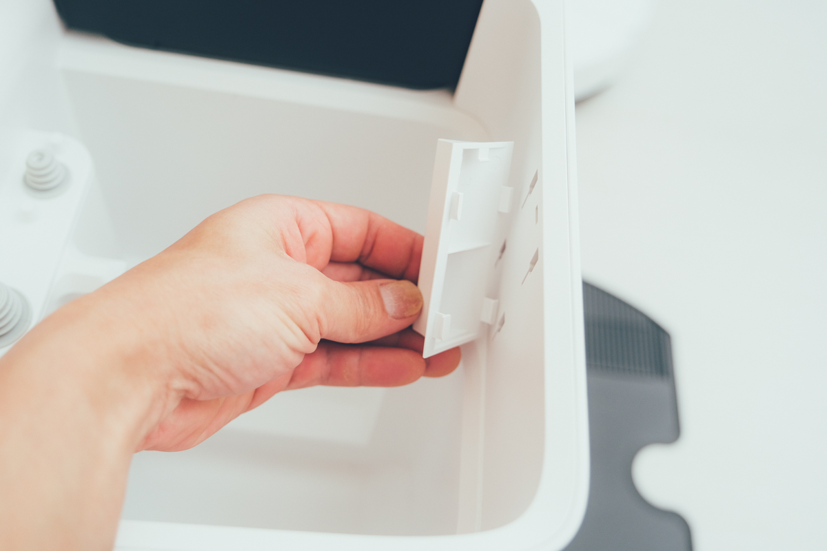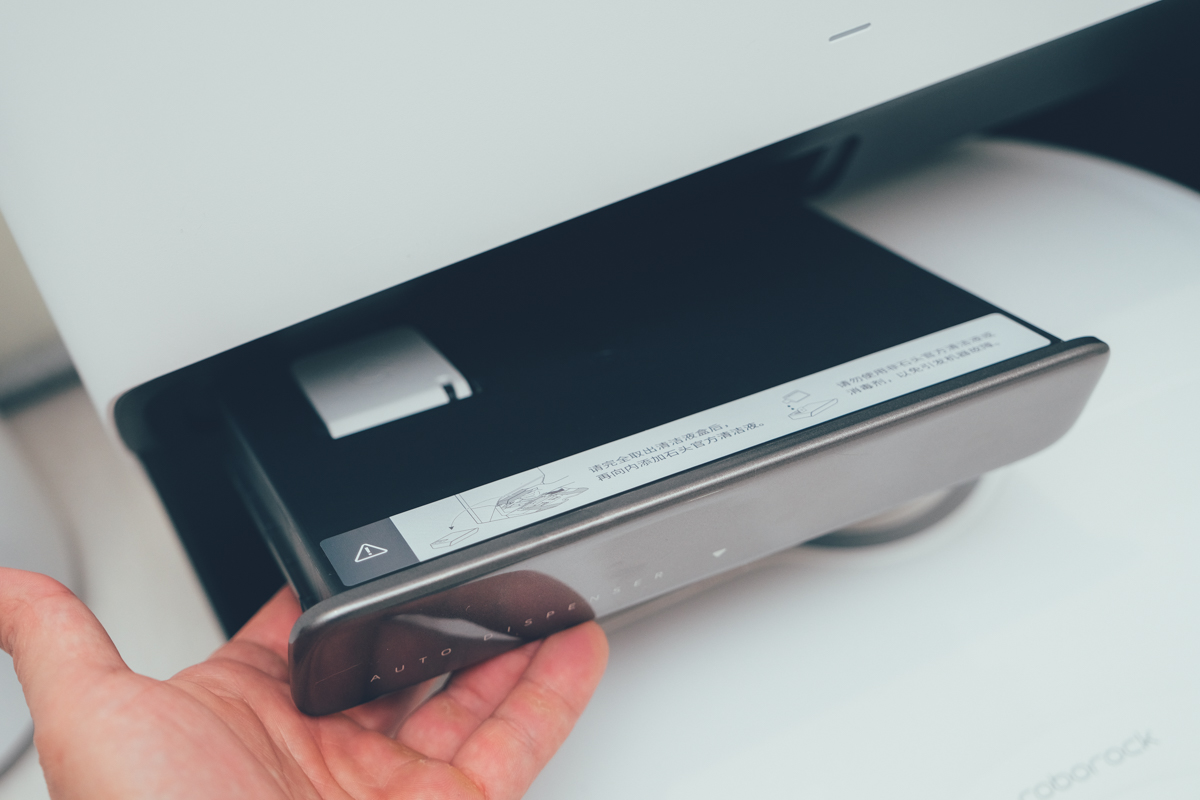 首先在清潔座前方的小盒子,拉開後可以在這裡加入石頭科技官方所販售專用的地板清潔液,可以透過 App 選擇是否在每次清潔時自動加入清潔劑,不需再手動添加清潔液了。