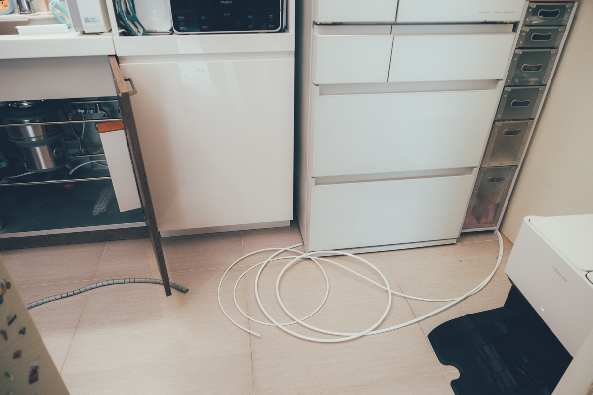 接下來,最重要的是,S8 Pro Ultra 就放在右側,我們要接到廚房水槽下,所以我決定繞著冰箱後方,然後將櫥櫃開孔直接進到水槽下!