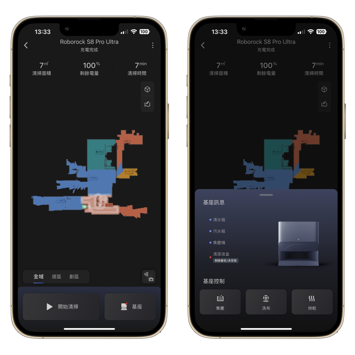 如果你原本就已經在用石頭科技的掃地機器人,我想應該換上 S8 Pro Ultra 只是一塊蛋糕,對於 App 的介面是駕輕就熟,基本上功能大同小異,只是針對全新的全自動底座,多了一些設定及功能,首先,在首頁下方右邊的基座,點擊後可以看到底座的各種狀態顯示,手動控制時,也可以選擇要單獨集塵、洗拖布或是烘乾。