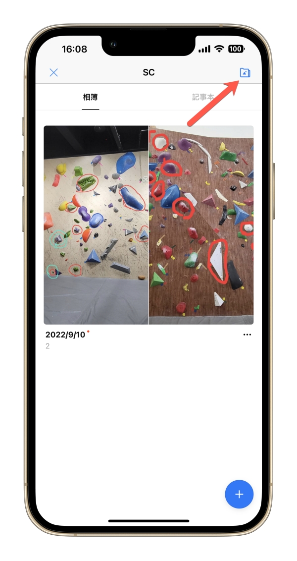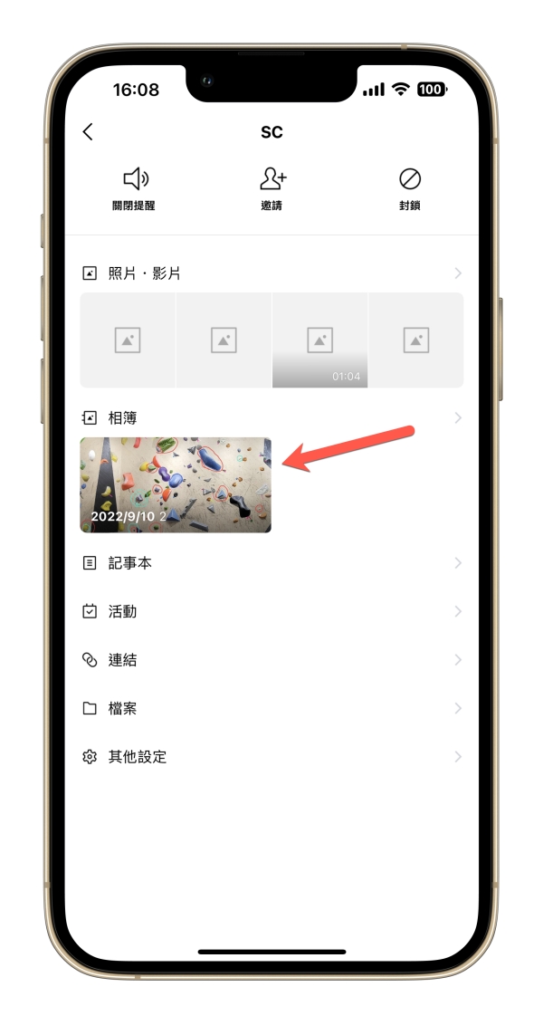 進到該聊天對象的相簿畫面時(就算沒有建立任何相簿也可以),右上角就會看到多了一個功能,點擊進去。