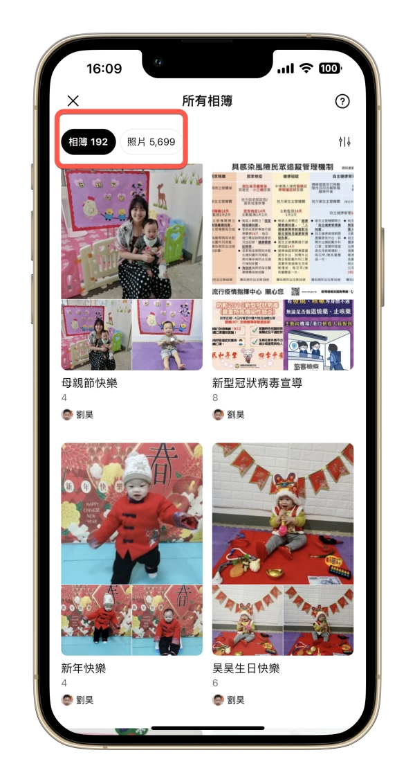 就可以在這裡查看所有「建立的相簿」,不論是你建立或對方建立的,只要是在你的聊天對象中的相簿,通通都可以在這裡瀏覽,發現推出這新功能後,我也往下滑了一下,意外的回憶起我兒子小時候的照片啊。