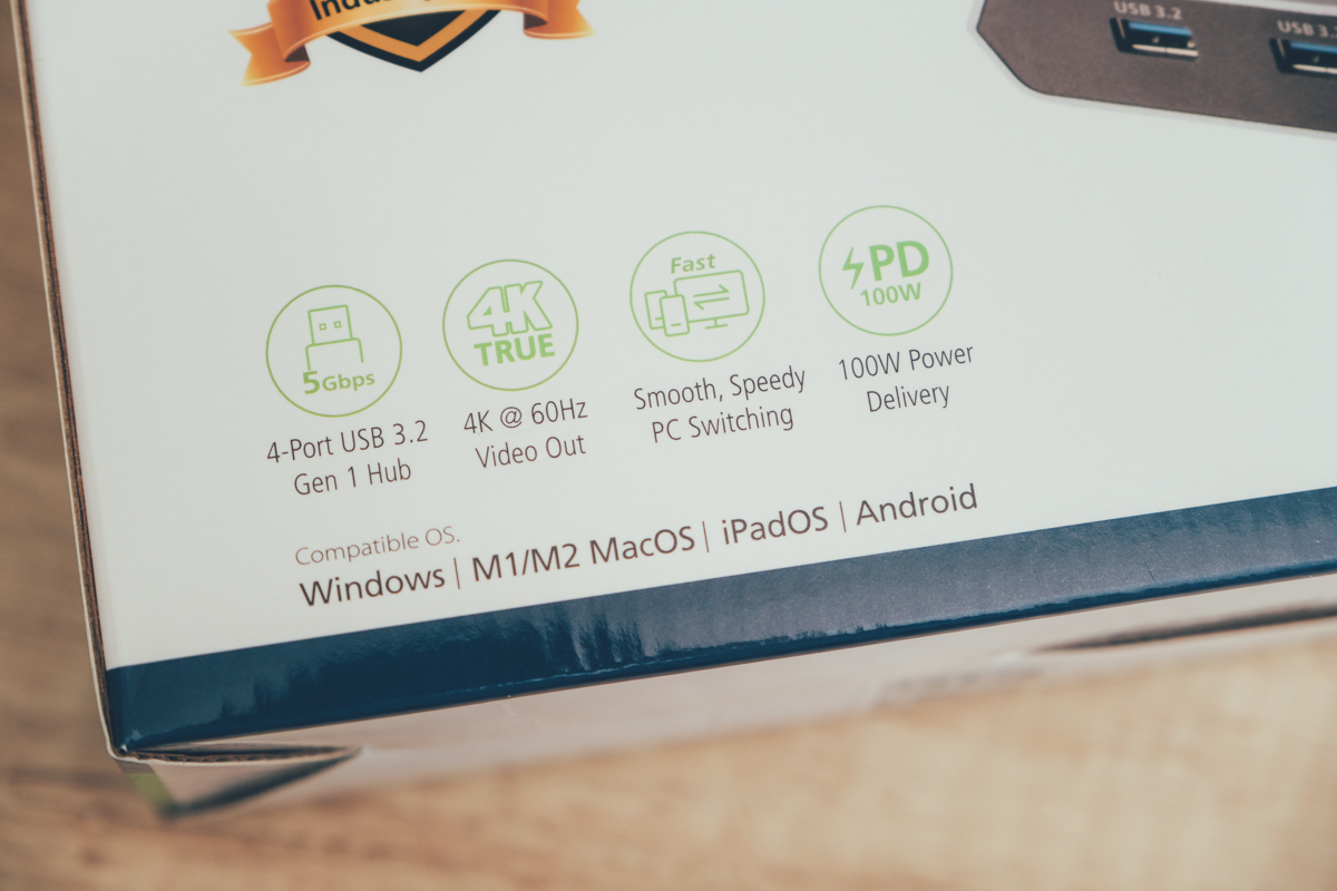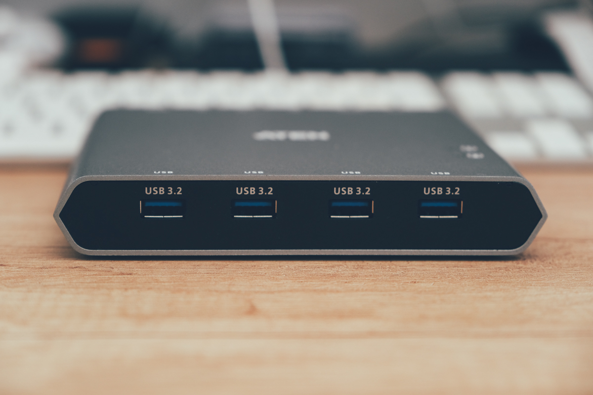 正面支援四組 USB 3.2,你沒看錯,是「3.2」, 所以如果你的電腦已經支援 USB 3.2 的話,透過這組 KVM 傳輸檔案,讓你的電腦依然可以發揮最快的傳輸速度(相較於 USB2.0 傳輸速度快 10 倍)。