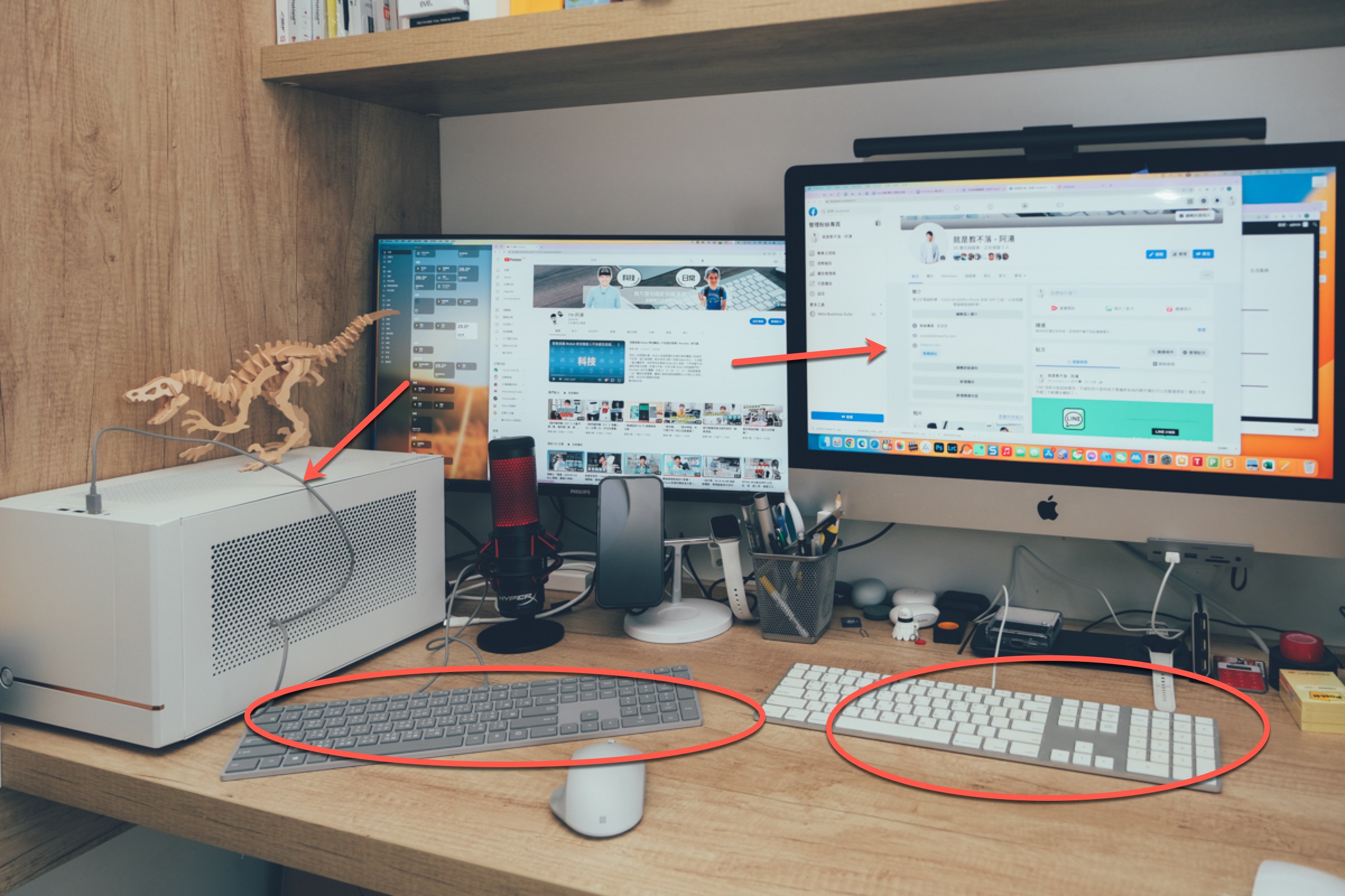 先給大家看一下我的工作區域,目前是左側一台 Windows 的準系統主機,右邊則是平常主力使用的 iMac,而左邊的螢幕 HDMI 1 是接 iMac 做為第二螢幕,HDMI 2 是接 Windows 主機使用,同時提供給二台電腦切換使用,平常要切換時就是直接透過螢幕切換,鍵盤滑鼠則是分開各一組,雖然談不上困擾但是真的蠻佔用空間的,但當我有其它週邊要切換到 Windows 主機上使用時就很麻煩,要拔來拔去。