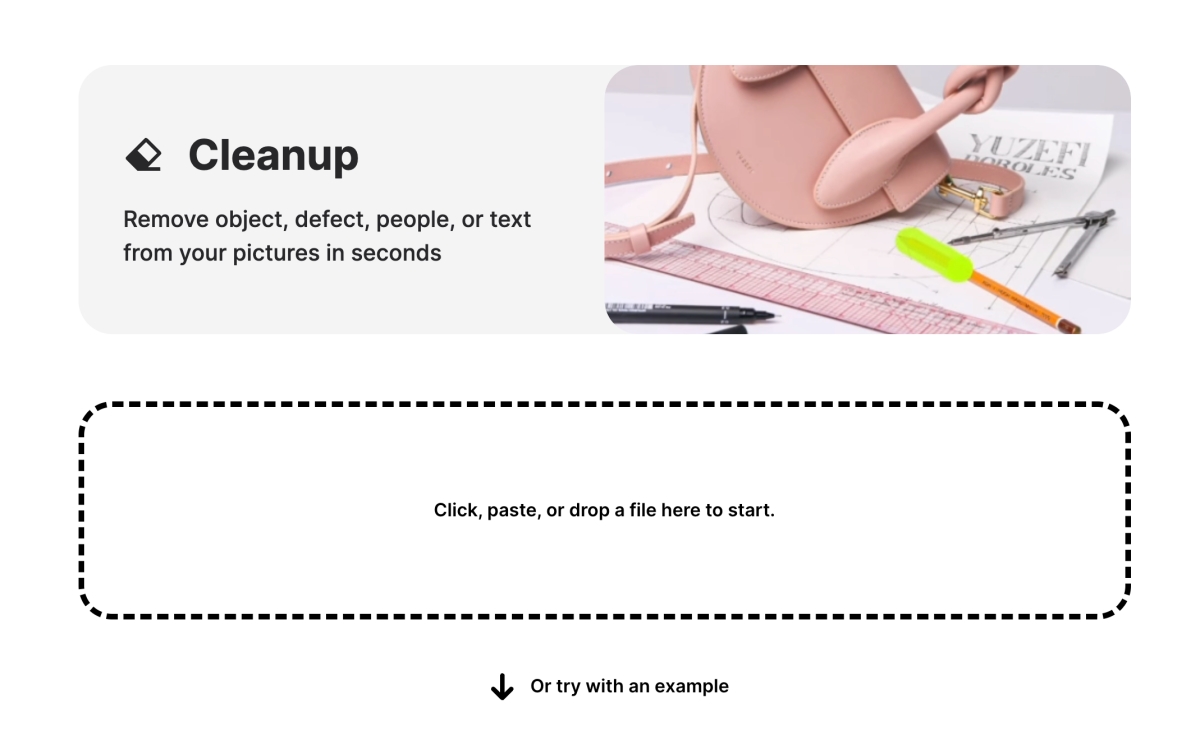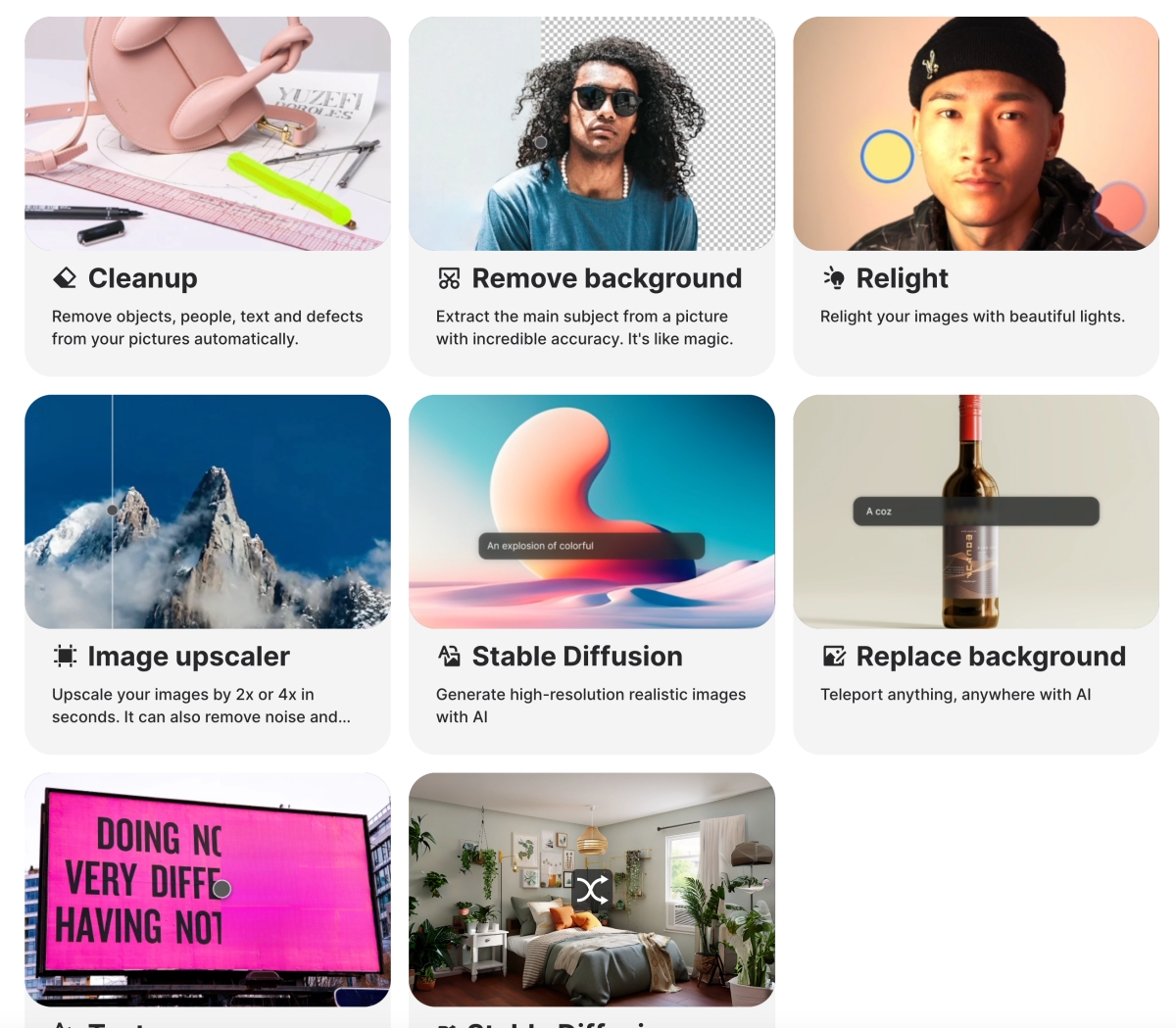 點擊 Try It Free 後,往下拉就能看到各種工具,包括去除照片中的雜物、圖像去背、照片打光、替換背景等,我們往下來試看看去除雜物。