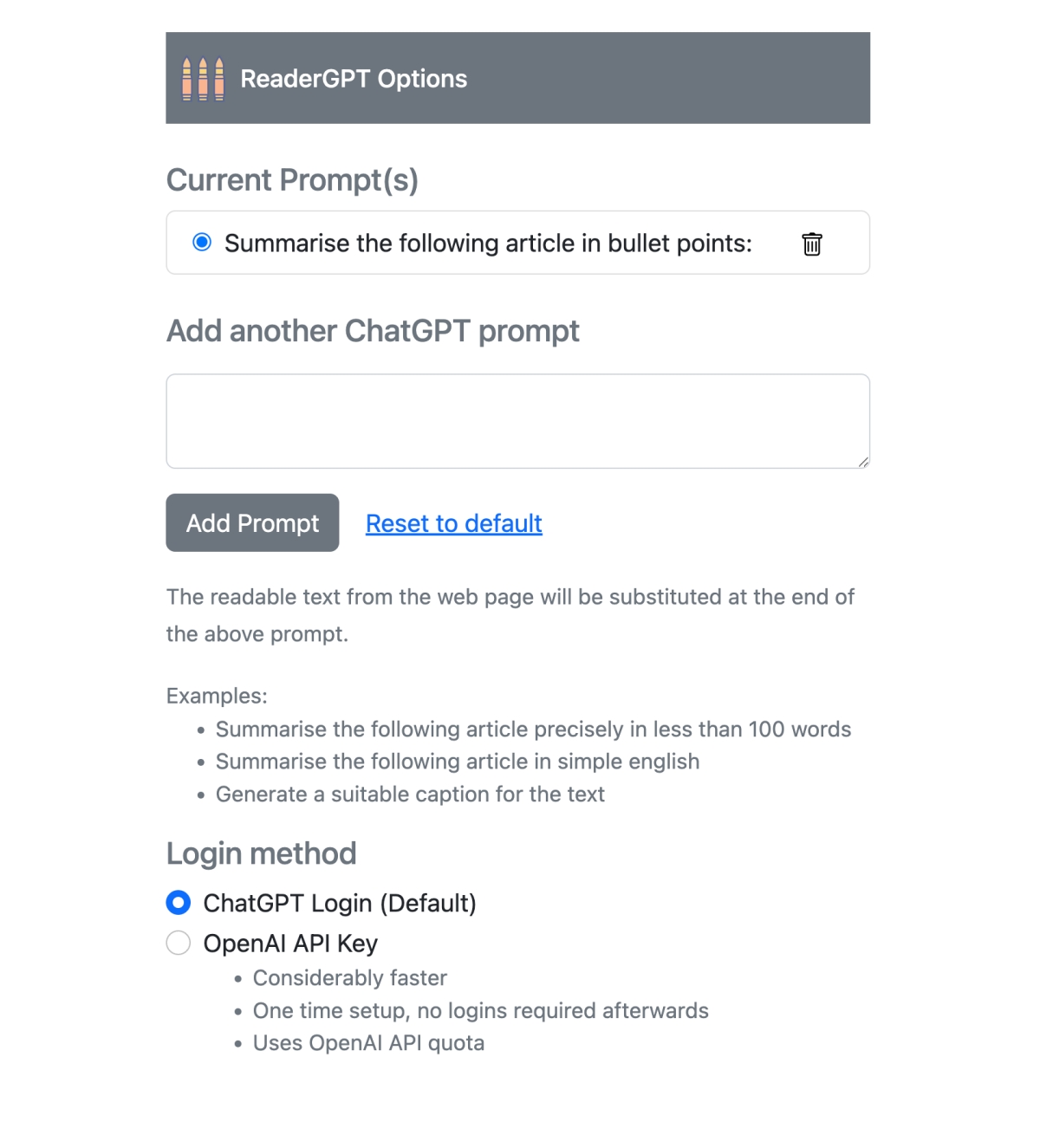 接下來的設定,這個 Prompt 的用意,主要就是當 ChatGPT 讀取完內容後,你要給 ChatGPT 的指令是什麼,我們可以先不添加內容,照預設來試試,而最下方可以先選擇連結 ChatGPT 的方式,建議可以照預設選擇 Login 就好。