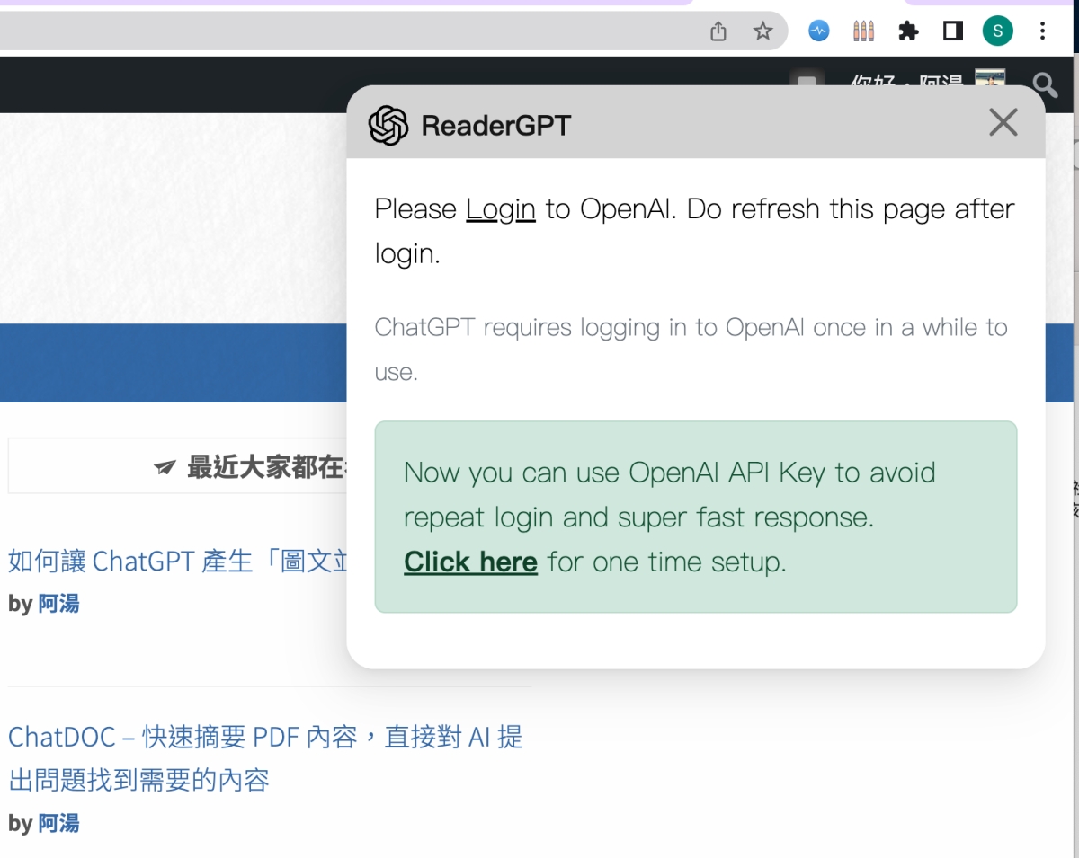透過 ChatGPT 所衍生出來的便利工具愈來愈多,這些工具本質上都還是透過 ChatGPT 來回答,只是讓你更快的去使用,不用自己貼上內容,比如今天要分享的 ReaderGPT,可以讓我們在閱讀網頁內容時,只要按一下,就可以讓 ChatGPT 整理內容,並列出重點給你,而 ReaderGPT 做的事,很單純的只是把這網頁的內容貼去給 ChatGPT 讀取後幫你摘要內容,你自己也能做到,但透過 Chrome 套件省去複製貼上的動作,也不用每次講指令,其實還蠻方便的。
