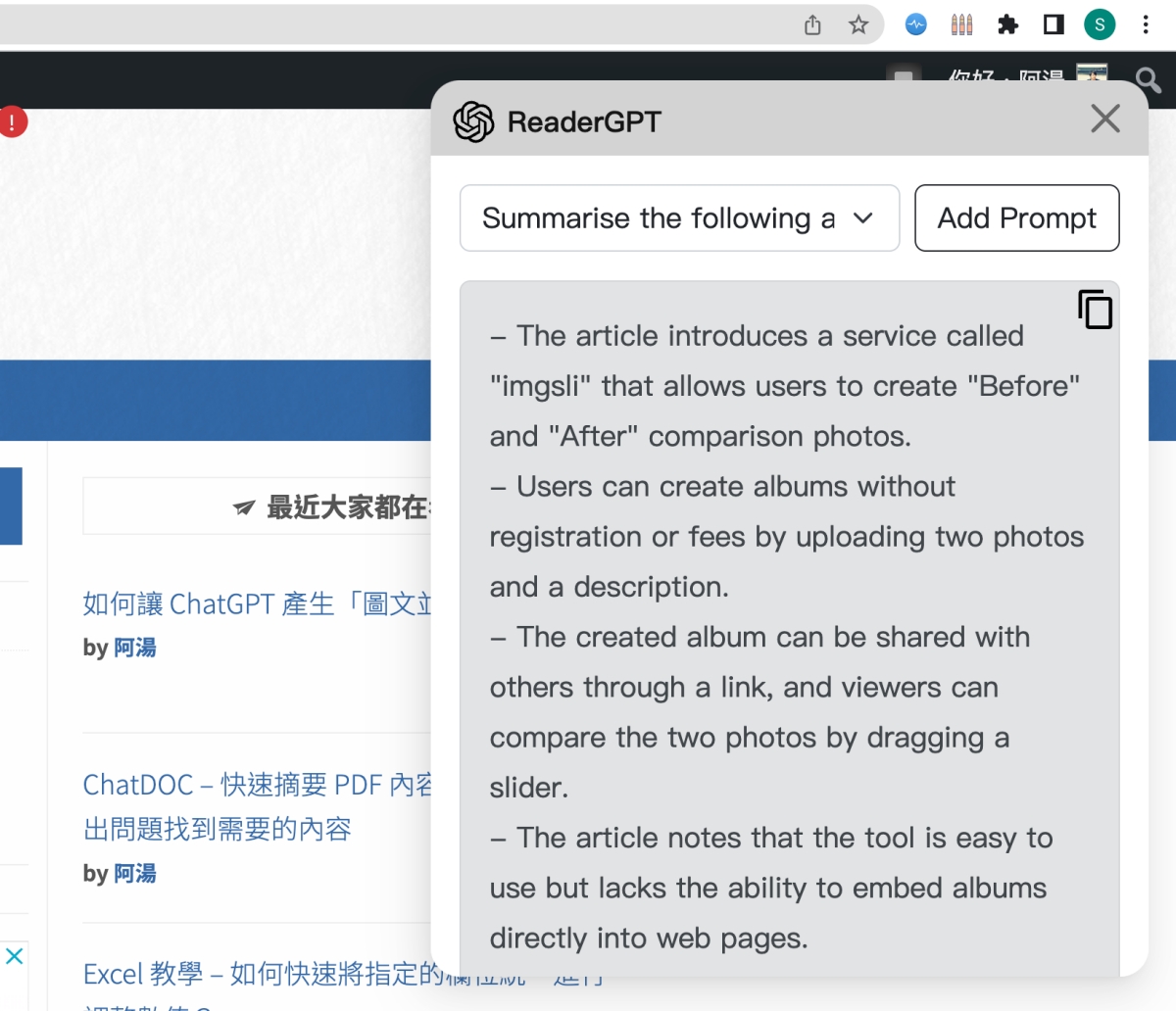 然後當你要摘要網頁內容時,只要按一下擴充套件的圖示,就會自動幫你把內容送去給 ChatGPT 讀取然後整理重點,不過預設的 Prompt 是用英文描述,所以得到的摘要也是英文。