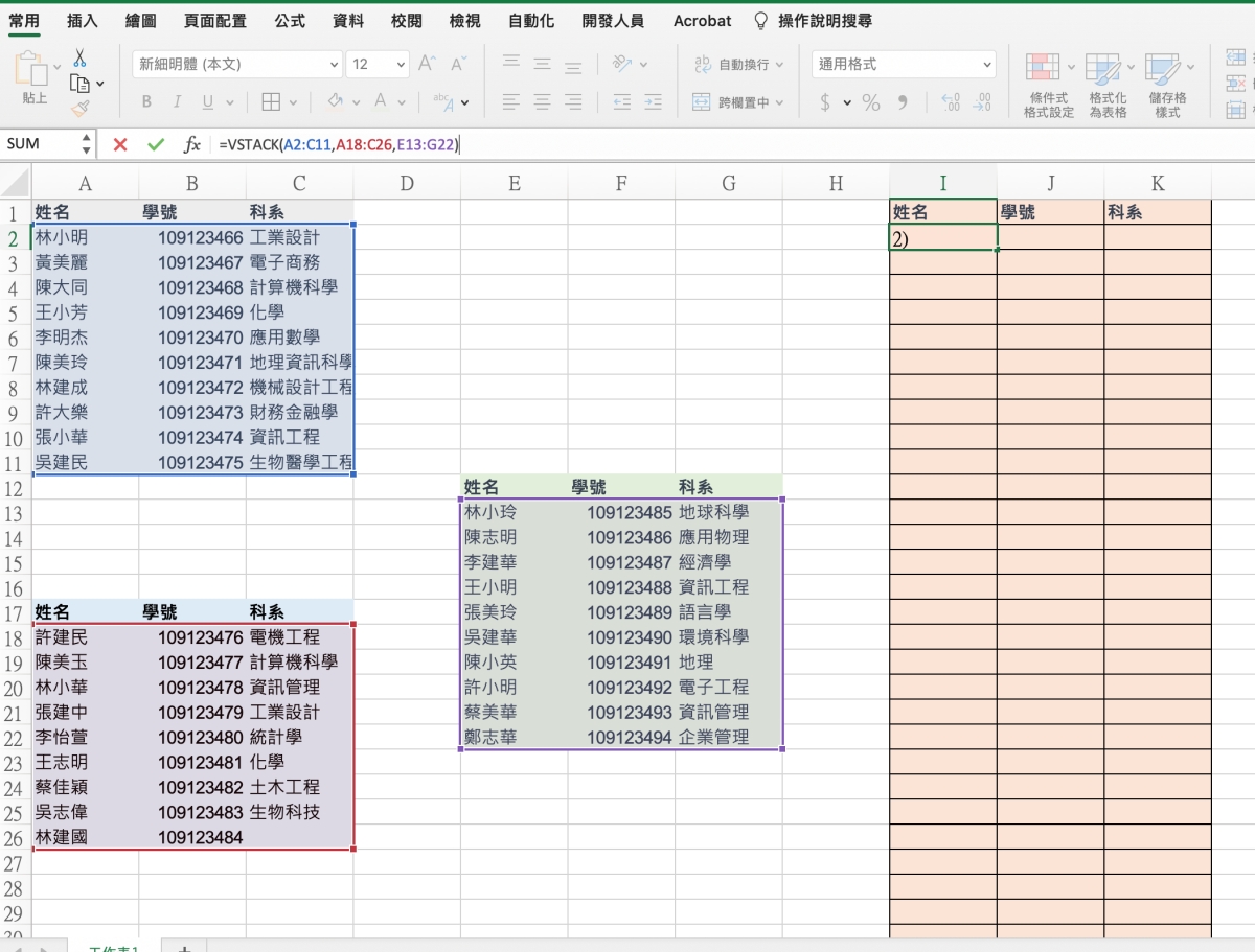 最近被問 Excel 的頻率愈來愈頻繁,今天被問到的問題是,他在統整資料時,想要整理不同的分頁表格,合併在同一頁時,要怎麼做比較快,目前他的做法就是複製貼上,不知道還有沒有其它方式?其實如果要用函數來做,只要版本夠新,是可以用上新的函數 VSTACK,就能快速的將不同區域的表格進行合併,不需要一個個複製貼上,也不用搞的很複雜的函數,各別加入要合併的範圍就搞定。