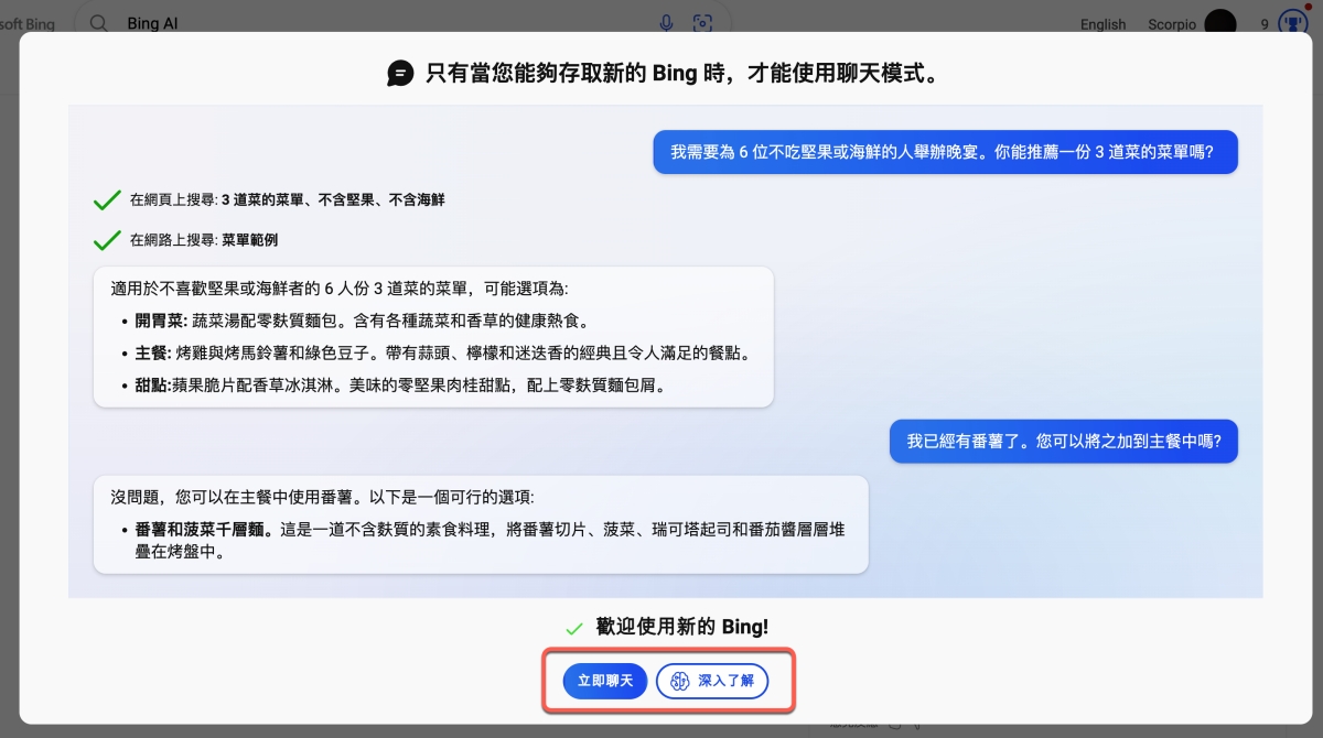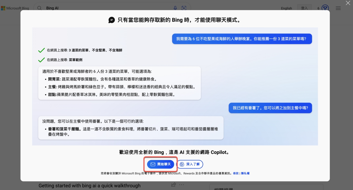 不過上面的步驟其實也可以更簡略一點,你只要使用 Edge 瀏覽器,登入 Microsoft 帳號的情況下,直接在 Bing 搜尋引擎中就可以看到聊天。