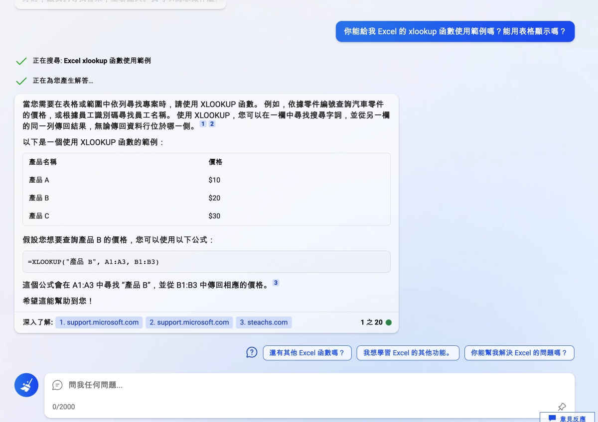 比如用來學習 Excel,這個部份基本上和使用 ChatGPT 並不會有太大的差異,但基本上 Bing 是先透過自家的搜尋引擎再去擷取內容後提供解答,目前我覺得 Bing 的搜尋引擎由於還有待加強,所以在解答上並不會比 ChatGPT 強大,但我想這相對的,雖然資料庫累積的愈來愈多,AI 被訓練起來後就會變更厲害了。