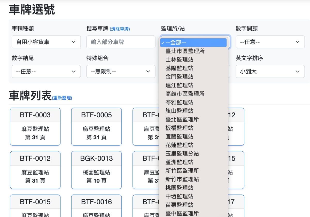 進入網站後,上方有很多條件可以設定,包括車輛種類、車牌、監理所/站,數字的開頭跟結尾,特殊組合以及排序方式,選了之後下方就會立刻顯示結果。