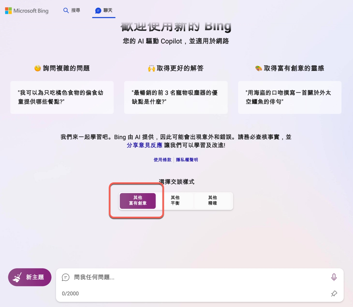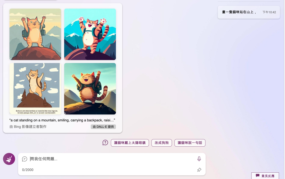 想要在聊天畫面裡直接使用繪圖 AI 功能的話,要先將交談模式切換成「富有創意」,就可以給它繪圖的指令。