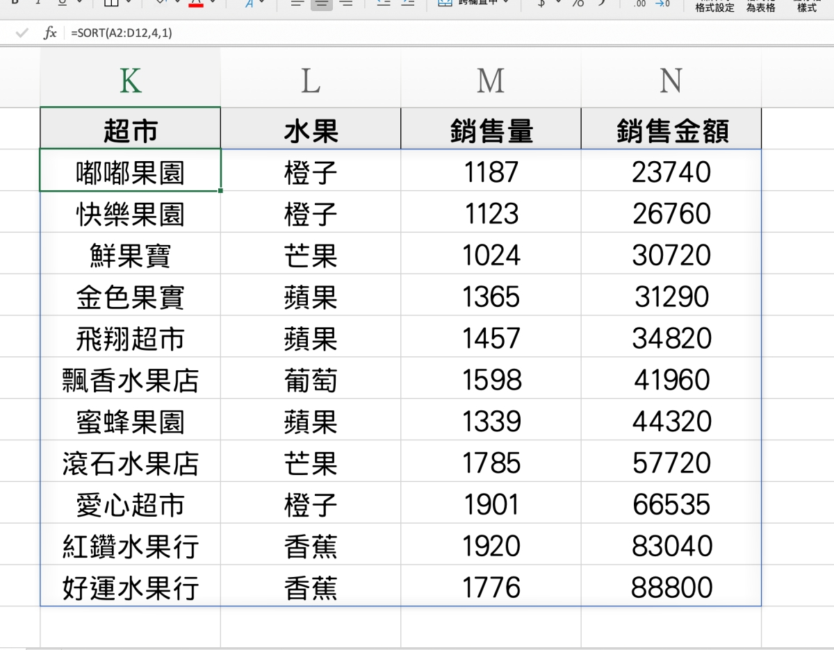 範圍大家應該沒有問題,第三個輸入 3 就是用銷量來排序,輸入 4 就是用銷售金額,而最後一個參數 1 就是小至大,-1 就是大至小,第四個參數不填的話預設是按照列排序,一般可以不填。