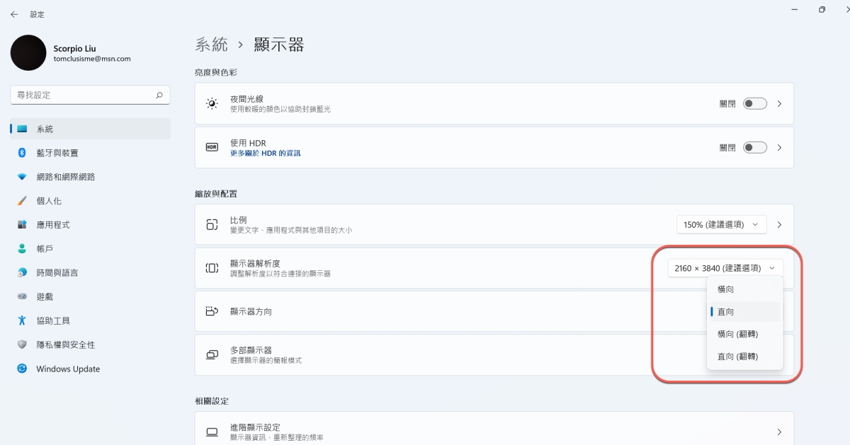 下方就可以選擇要旋轉的角度,看你在安裝顯示器時是怎麼轉的就選擇對應的角度就可以了,另外也建議轉成直式後解析度也可以調整一下,因為像 4K 螢幕其實轉直後字會變超級小哦。