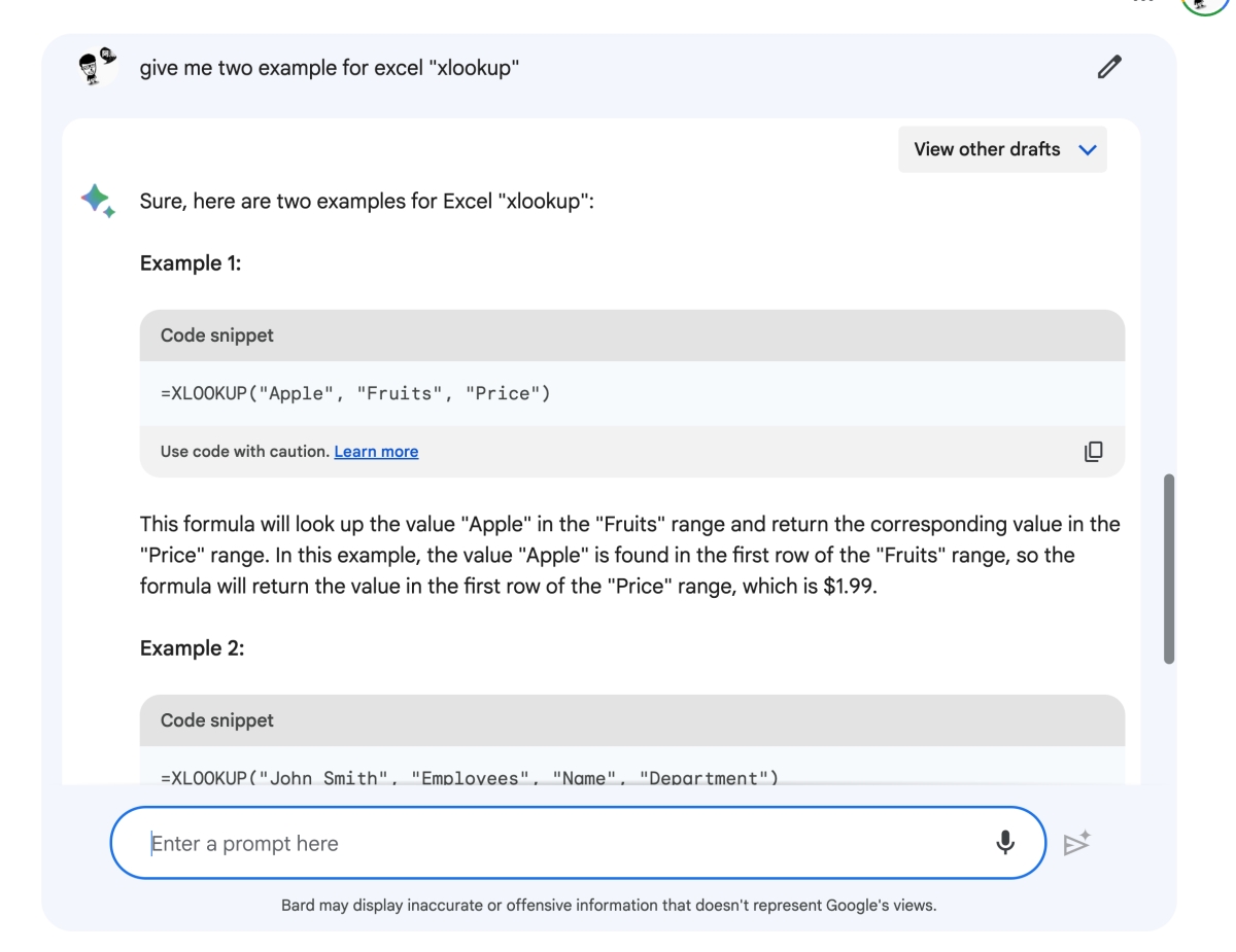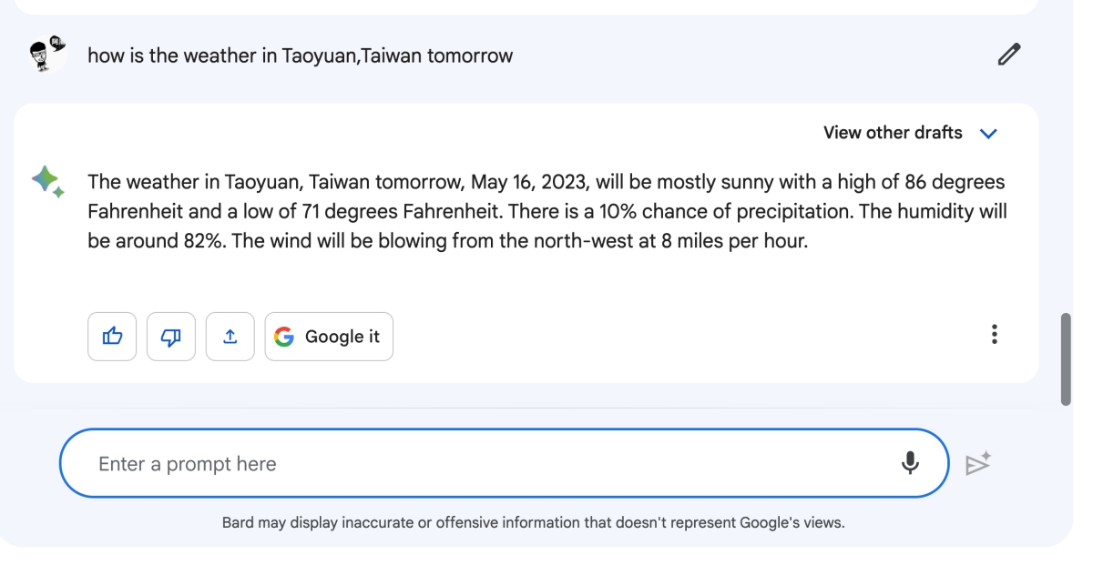 和 ChatGPT 相比之下有一個最大的差異,Google 的 Bard 可以問他現在進行式的東西,因為有結合 Google 搜尋以及自家的一些內容,而 ChatGPT 目前只能回答之前的資料。