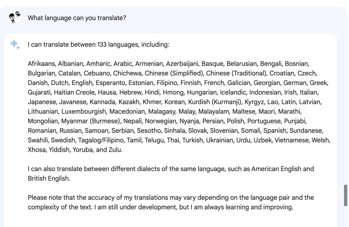 至於翻譯的功能,你問他可以翻譯哪些語言,他會回你 133 種,但是目前還沒正式開放就是。