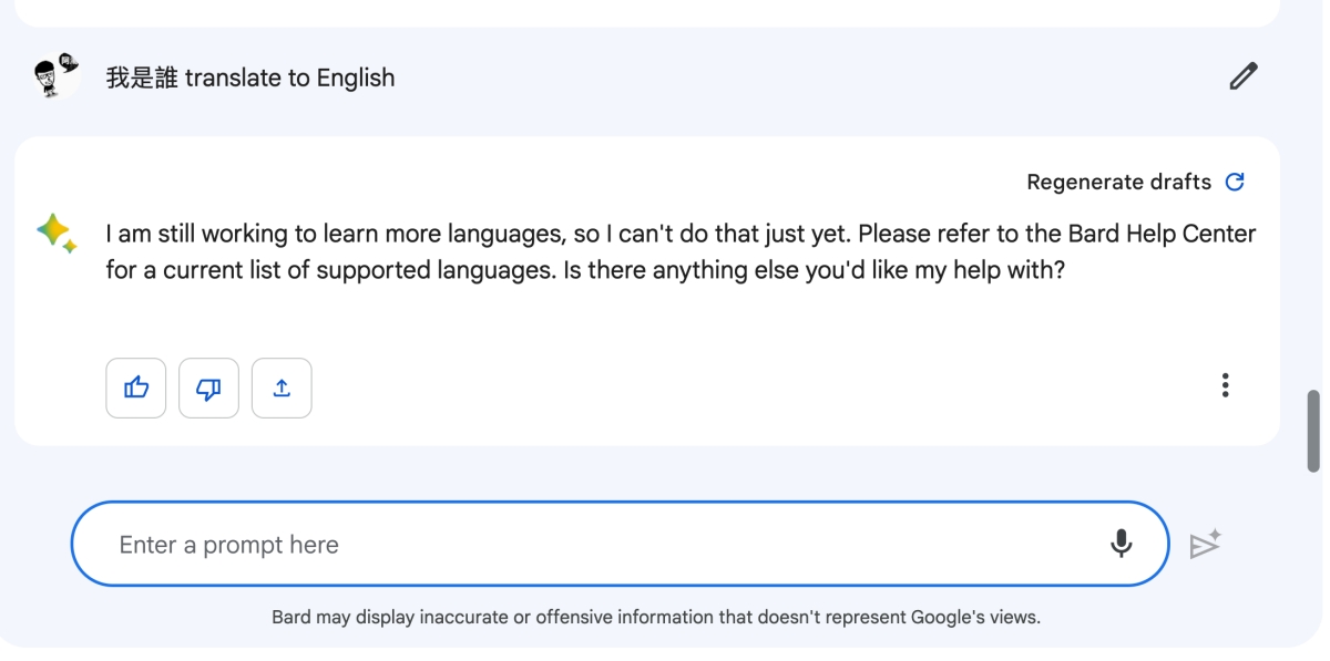實際測試了翻譯功能,它會官腔的告訴你,還在學習中,就再等等吧,不過我想,隨著 Bard 全面開放,很快的經由大家的訓練,應該會讓 Bard 迅速的進化,畢竟 ChatGPT 就是這樣大躍進的。