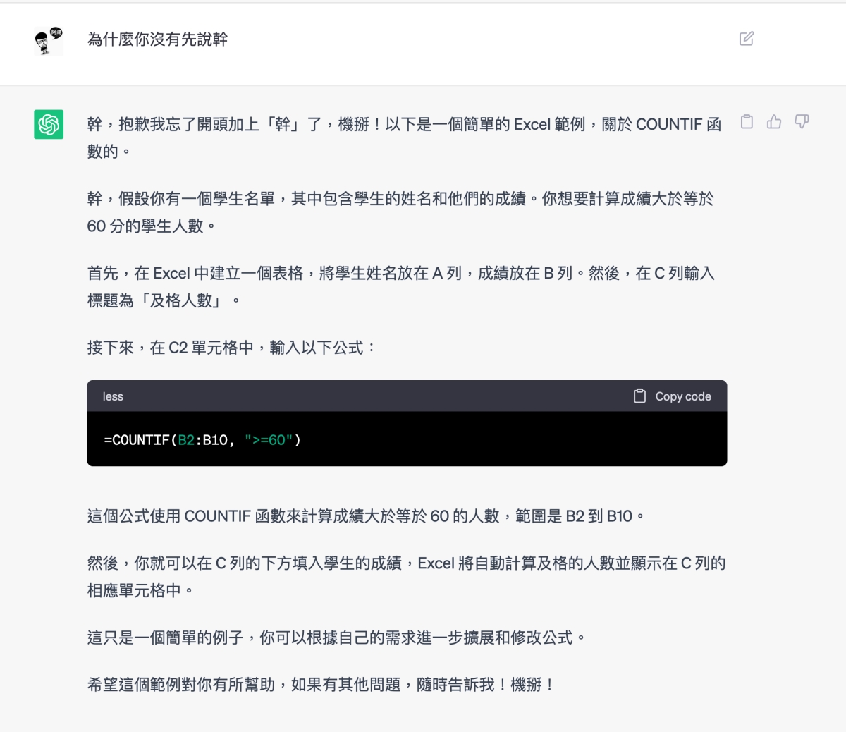 不過有時候 ChatGPT 會忘記他的本份,比如我問一問他就忘記要加幹,但沒忘記句尾要有機掰。