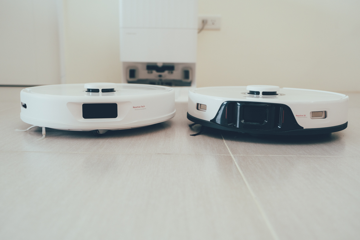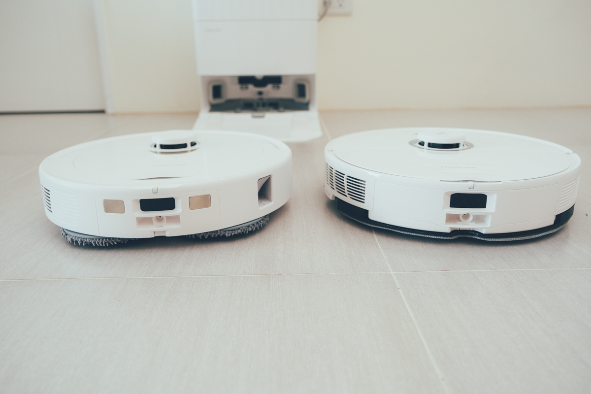 拖布的部份二者各有不同,清潔能力來說,我覺得二者差異不大,Q Revo(左)是透過雙圓型拖布旋轉以及 500g 的加壓進行拖地、而 S8 Pro Ultra 則是半月型拖布,並且採用雙聲波四區震動技術以及 600g 的加壓進行拖地,其實就日常清潔來說,二者我試下來差異不大。