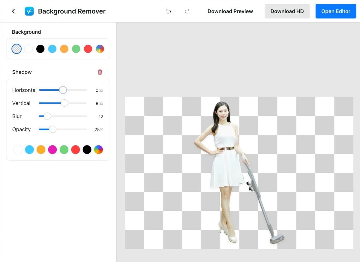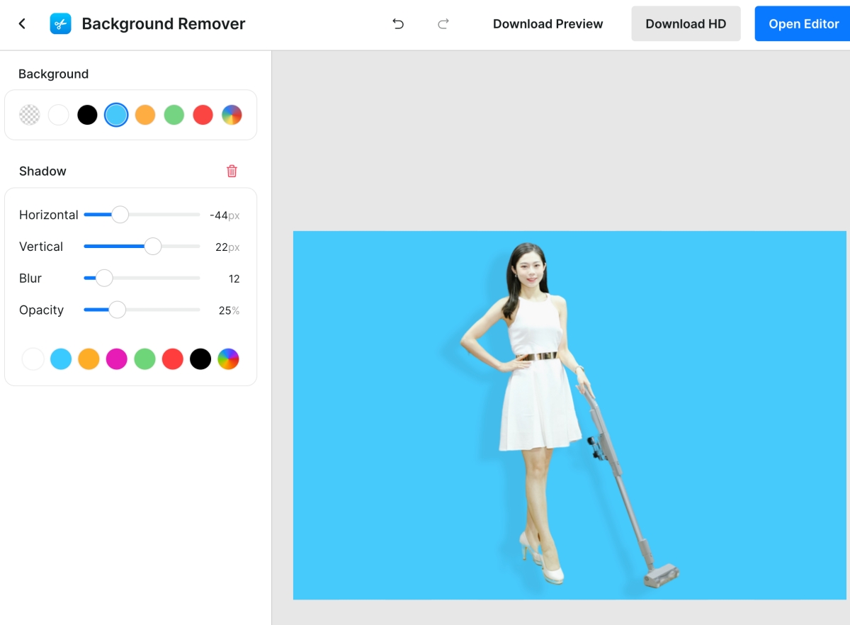 透過左邊的工具你可以置換背景顏色,也能幫主體加陰影。