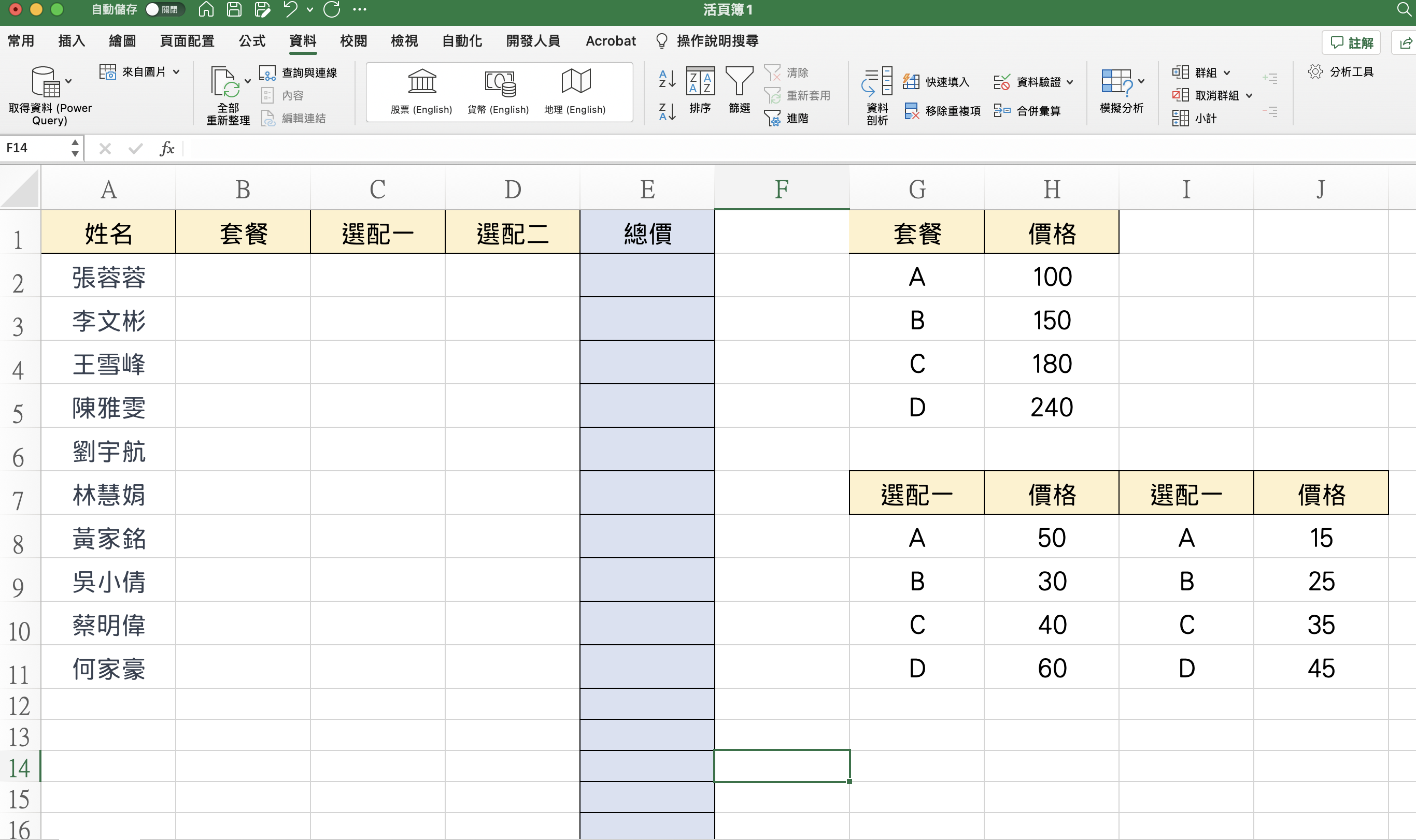 首先,我們想要做的表格像這樣,可能中午點餐時,大概會有像麥當勞或有不同餐點,這時可以做個表來快速解決統計每個人總價的問題,這邊我們用 VLOOKUP 來做,往下來看。