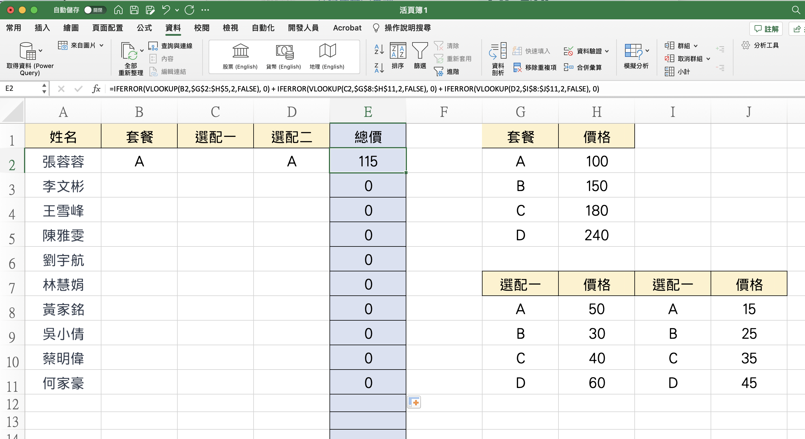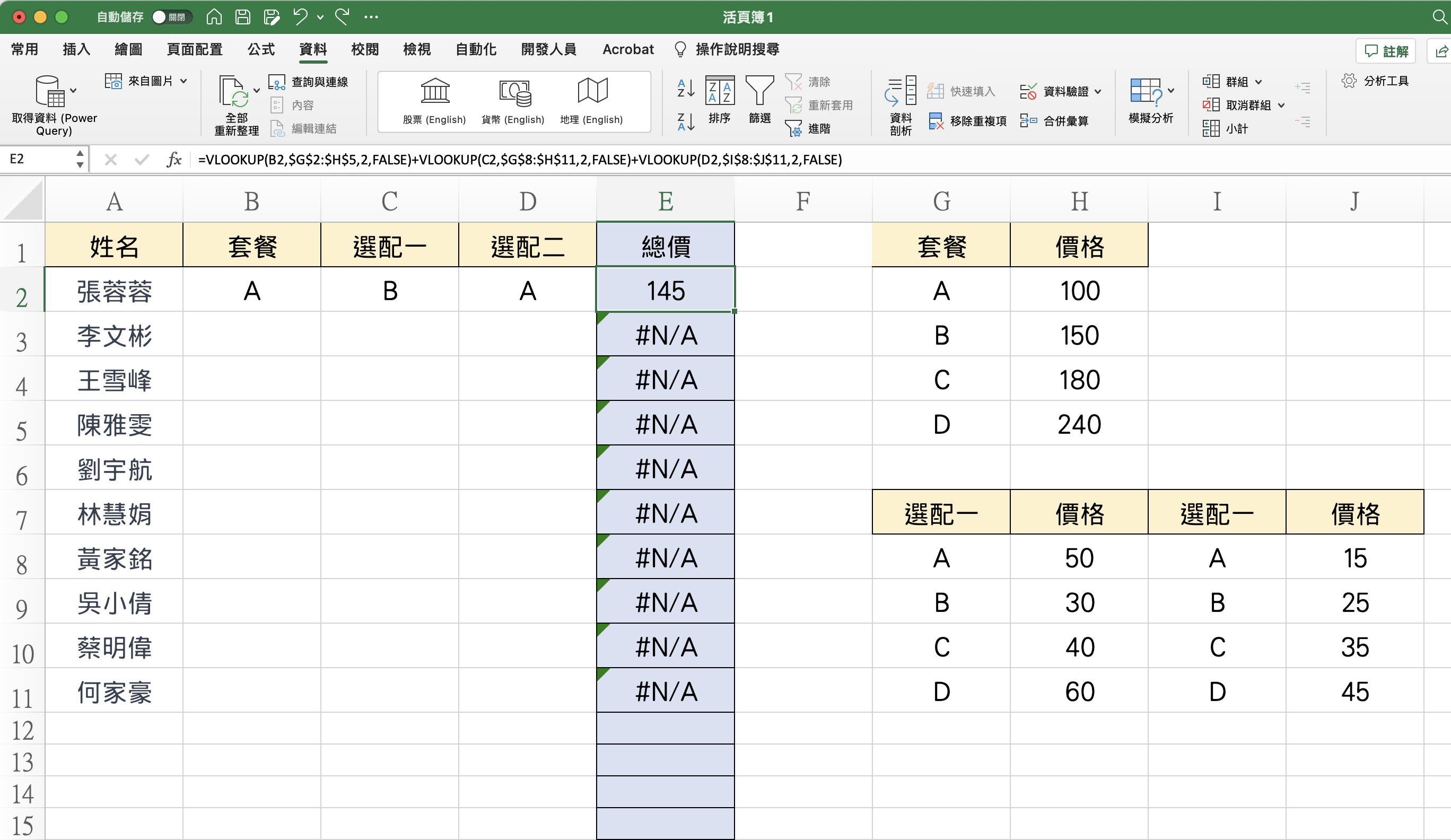 分別做三次 VLOOKUP 後相加就可以獲得總價,不過,就這樣了嗎?我們還有一些問題要解決,再往下來看。