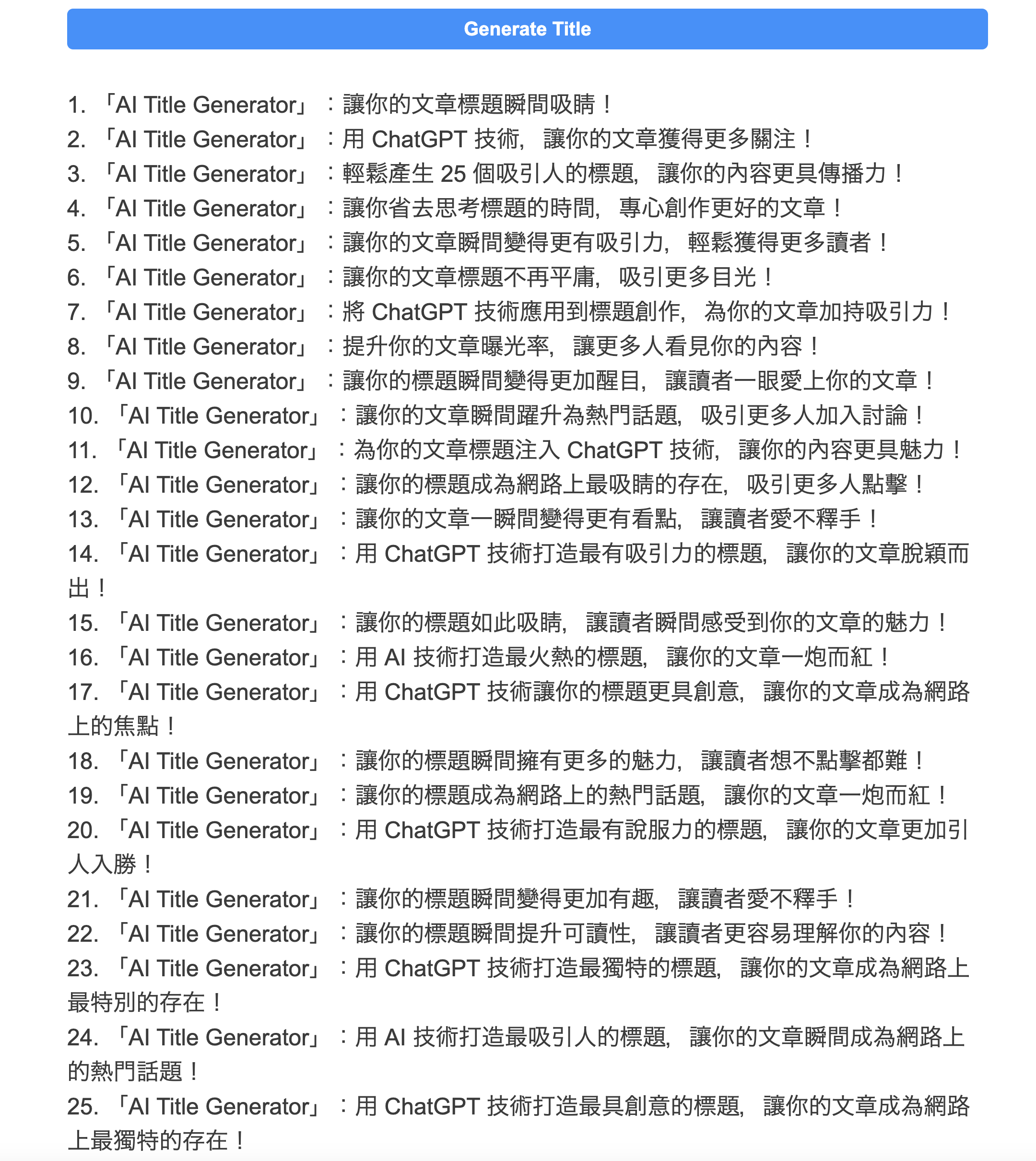 分析時間不一定,大概是幾十秒左右,一次會產生 25 個標題讓你選擇,不得不說,產出來的標題確實都蠻不錯的,幾乎都可以用,一次 25 個反而讓我選擇困難了啊....