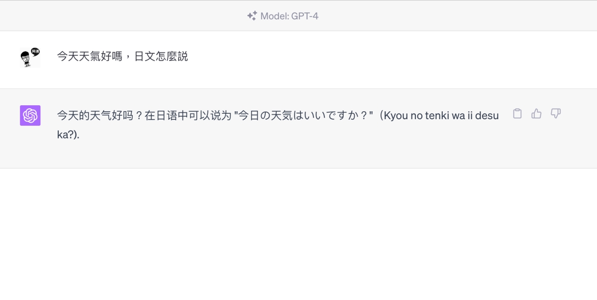 先給大家看一下,平常如果我們用 GPT3.5 版本來問的話,回答會像這樣,基本上跟翻譯軟體差不多,就是給你一次性翻譯。