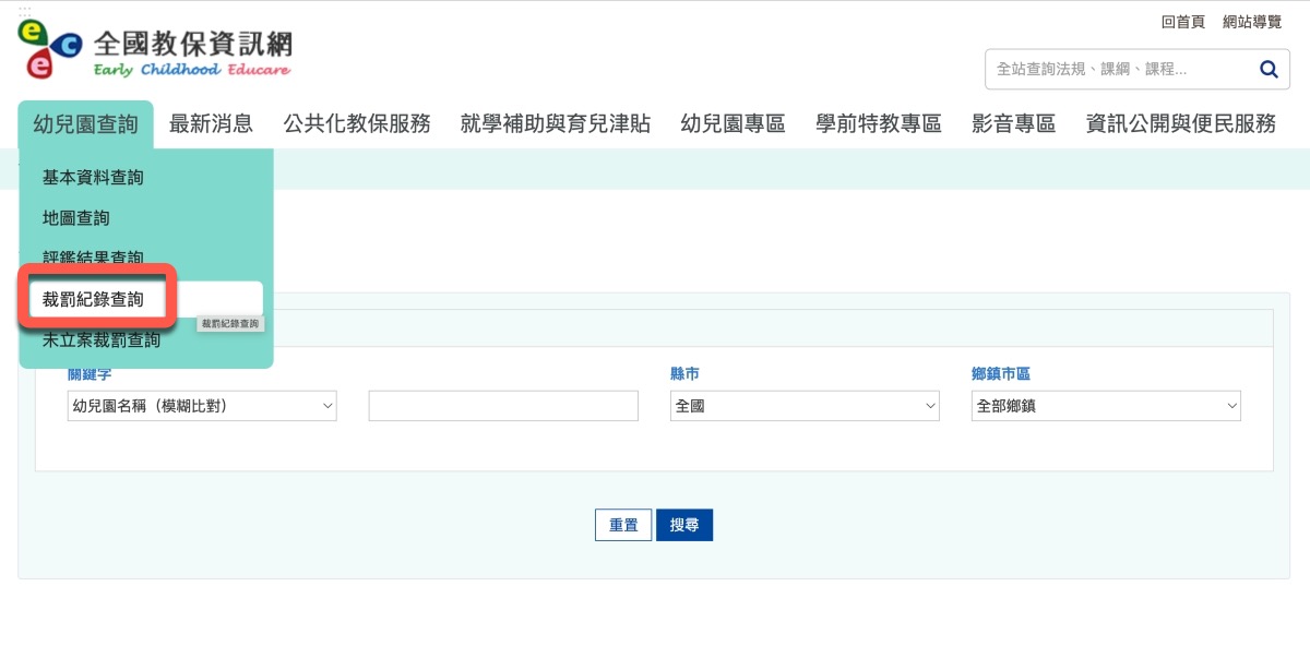 進到全國教保資訊網後,在左上角就有幼兒園查詢 > 裁罰記錄查詢。