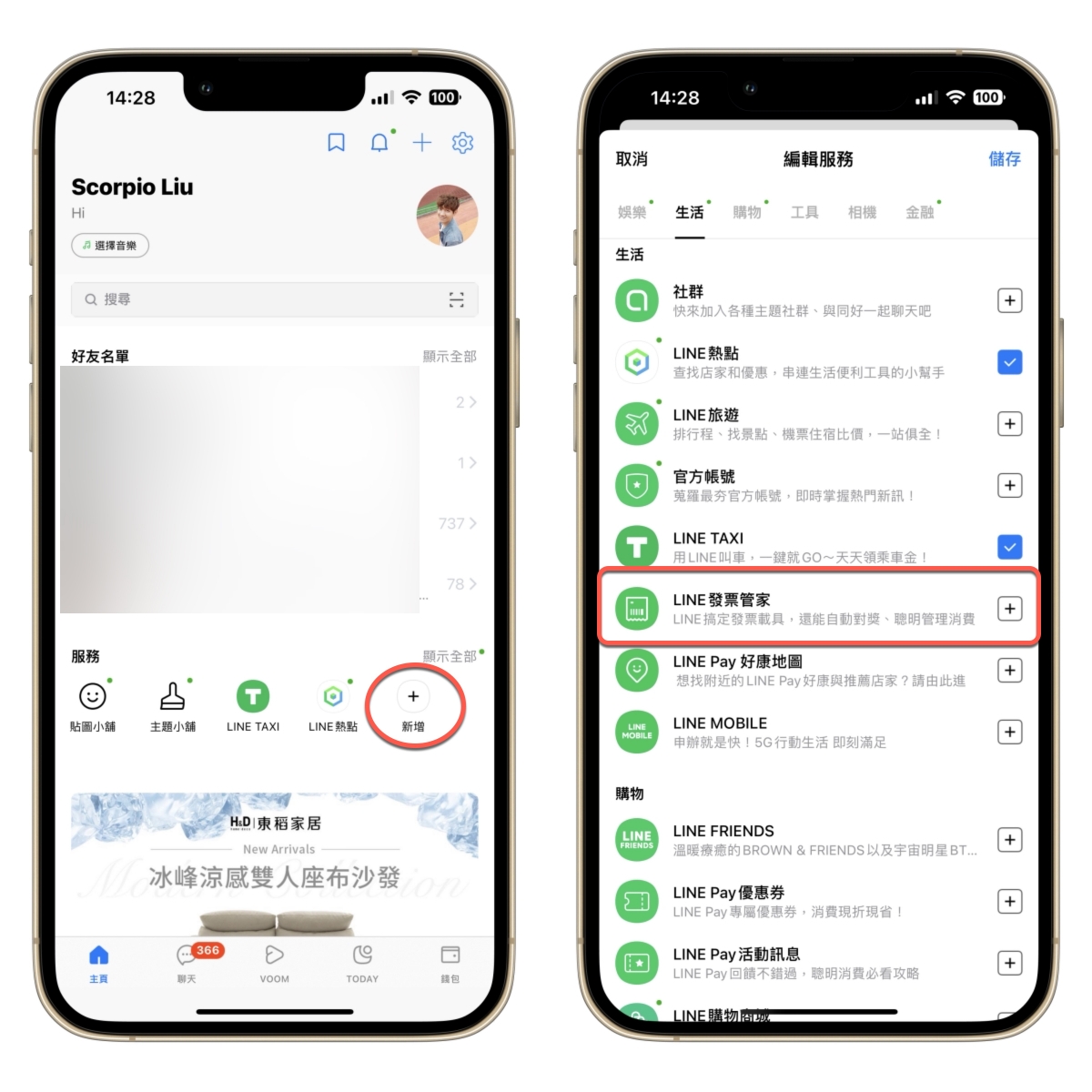 這個發票管家就藏在 LINE 首頁的服務裡面,你到你的 LINE 首頁,在服務那裡點擊 + 或是顯示全部,就可以在生活類別裡找到發票管家,然後把它加進去。