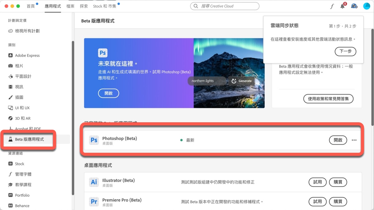 首先,這跟原本的 Photoshop 是分開的,不論是 Windows 或 macOS,你都要有訂閱 PS 的方案才能下載,打開 Creative Cloud 後,左邊可以找到 Beta 版應用程式,然後就能找到 Photoshop(Beta)進行安裝。