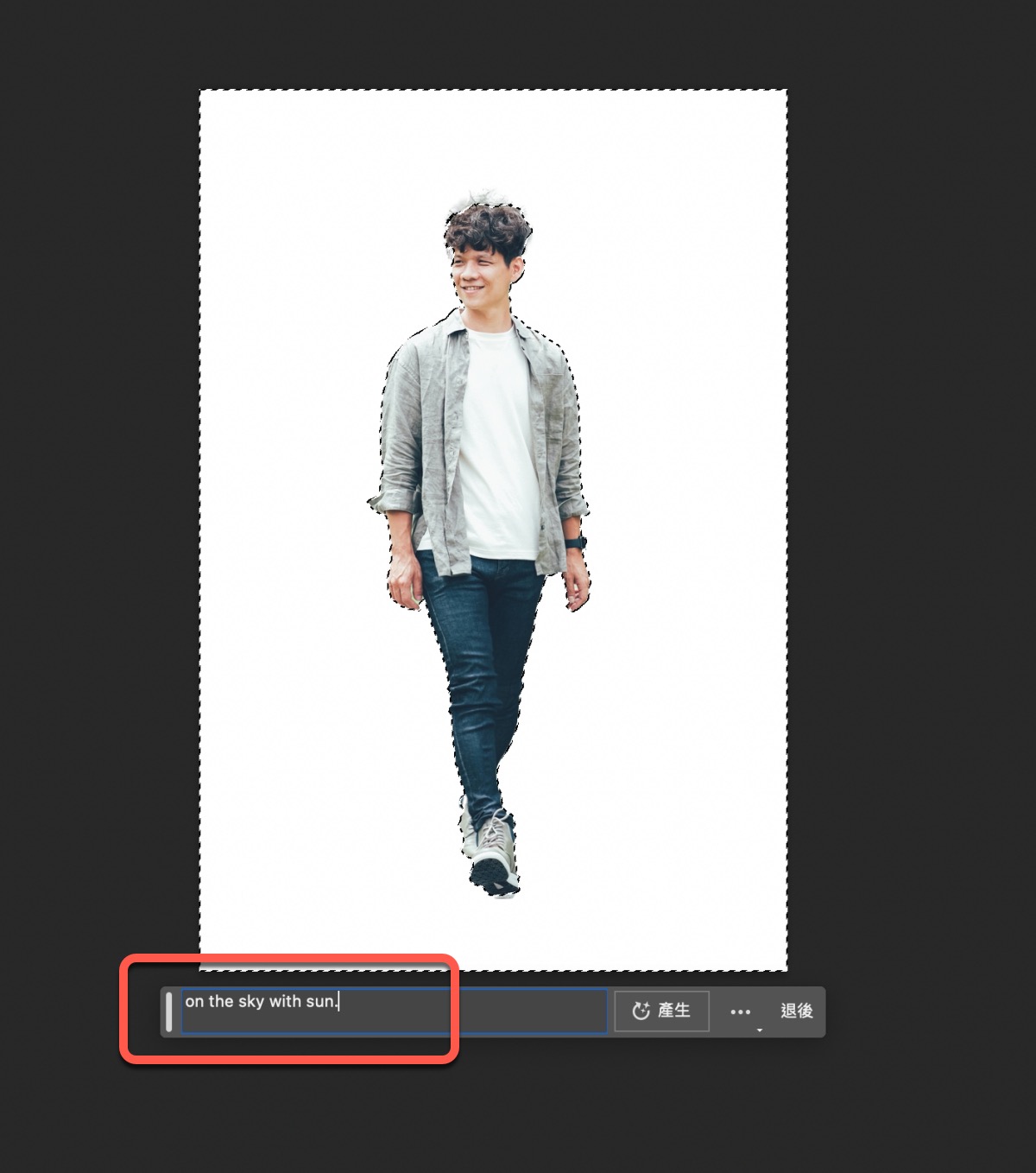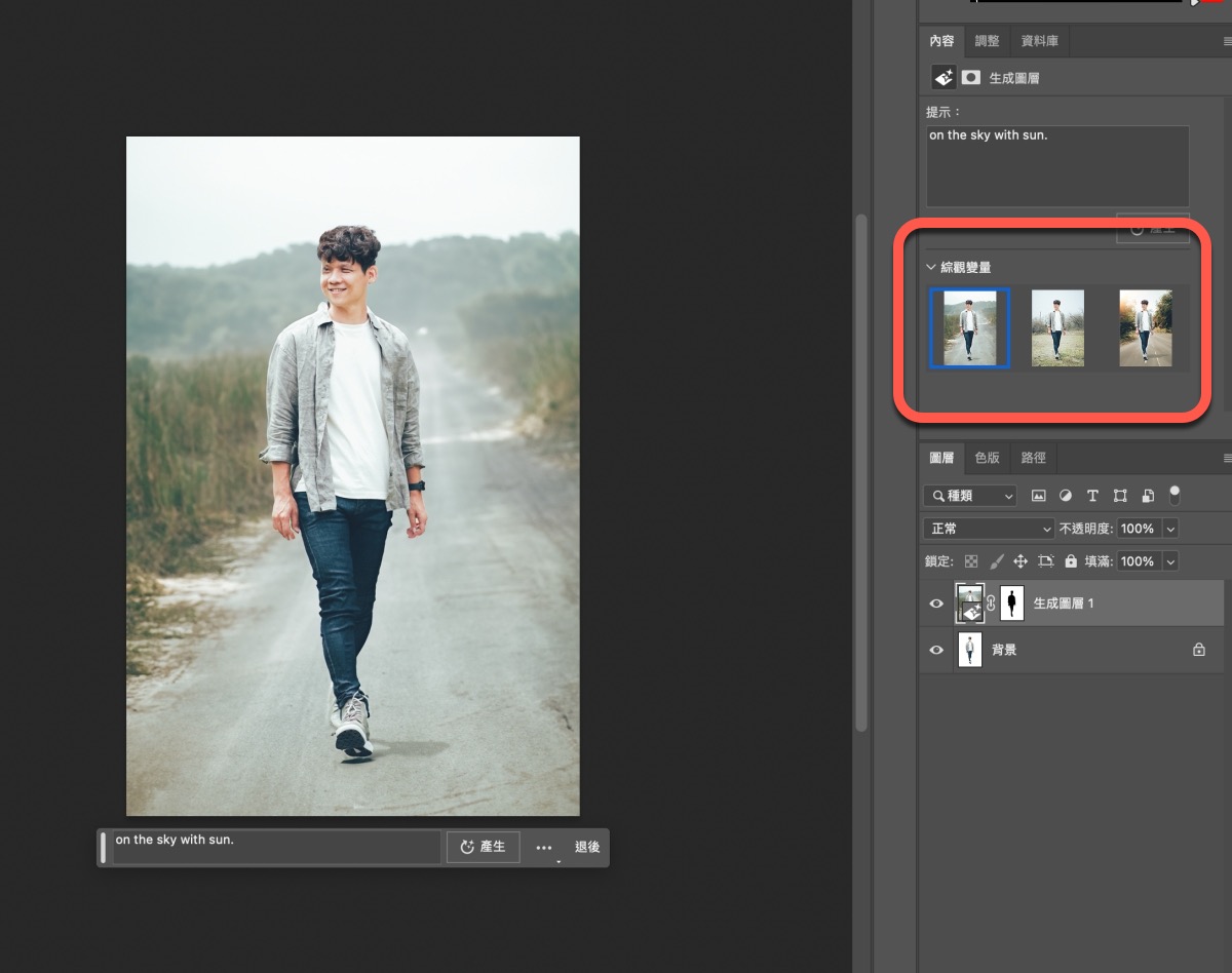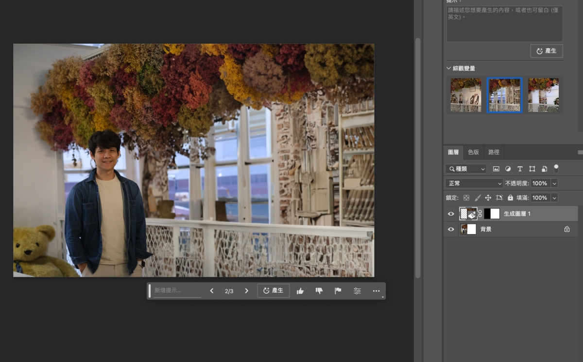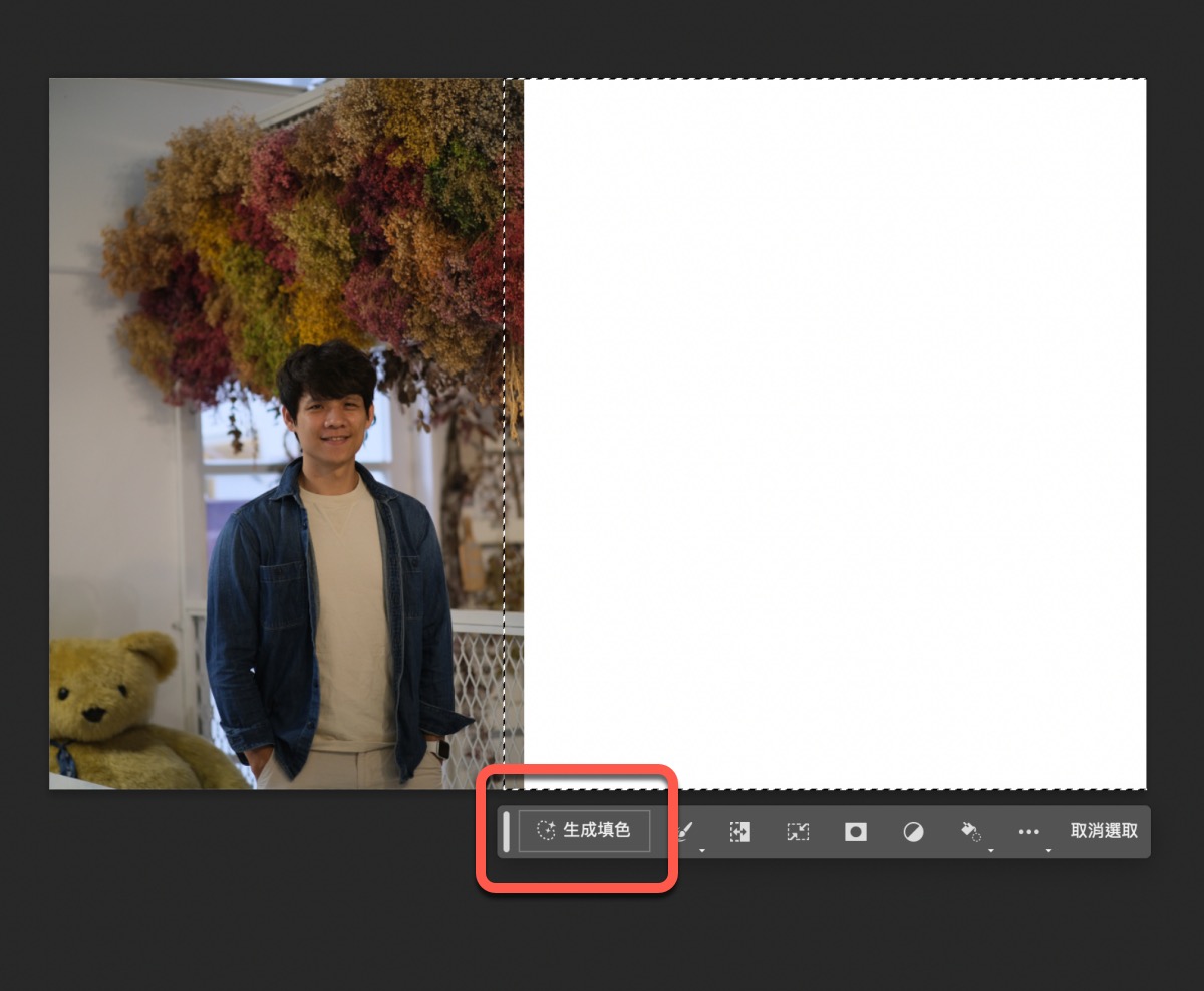 不過我覺得上面那種 AI 生成沒什麼,最厲害的是無中生有額外的空間,比如像這張,我把他往右延伸範圍後,選取起來按生成填色,然後什麼都不要填,直接按產生。