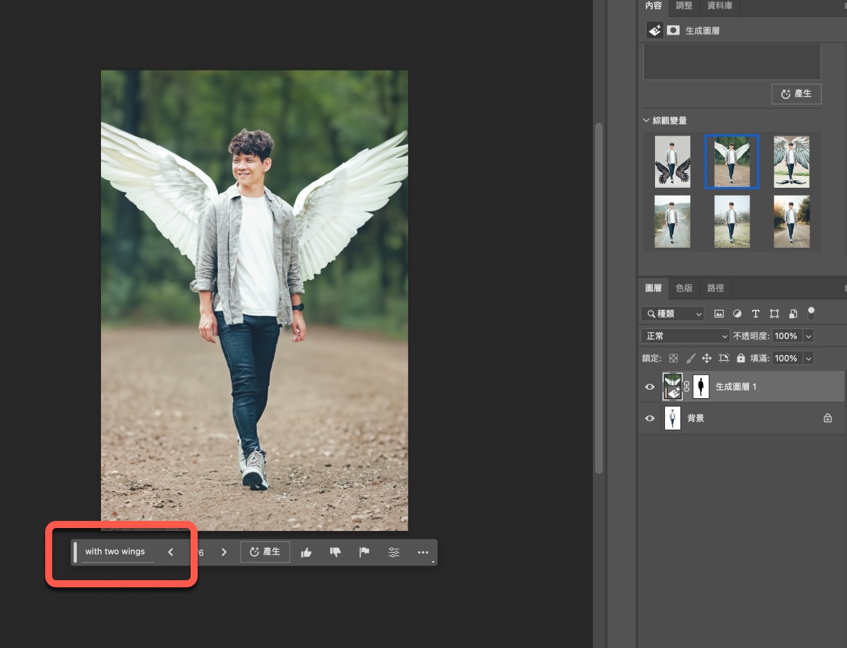 然後我輸入,要一對翅膀,這個就 P 的不錯。