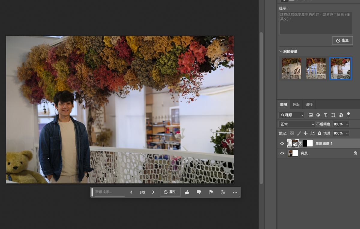 Demo 3 甚至在右邊創造出了個小空間在裡面,這生成填色是不是太強了一點,有在用 PS 的人一定要去試看看。