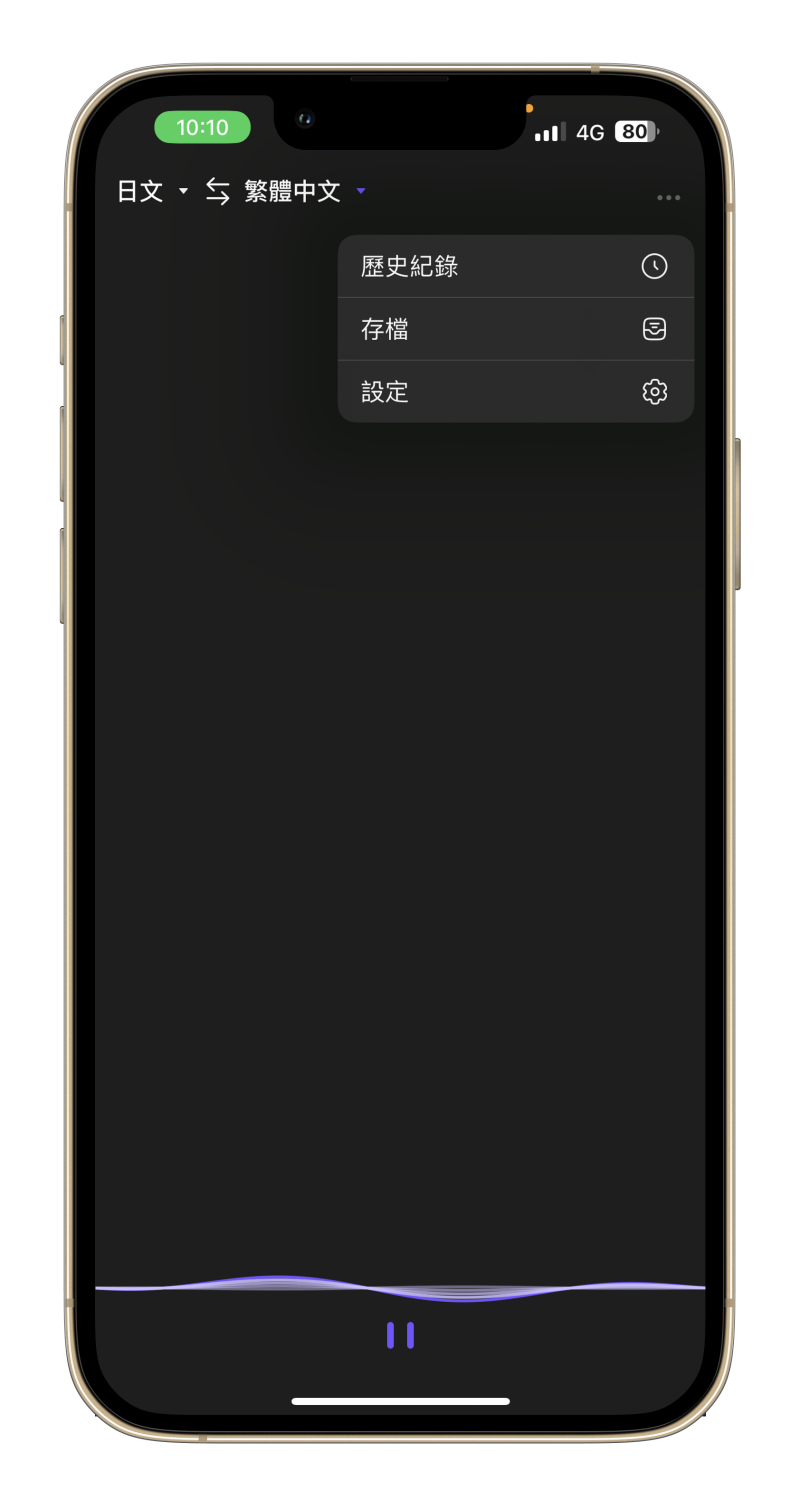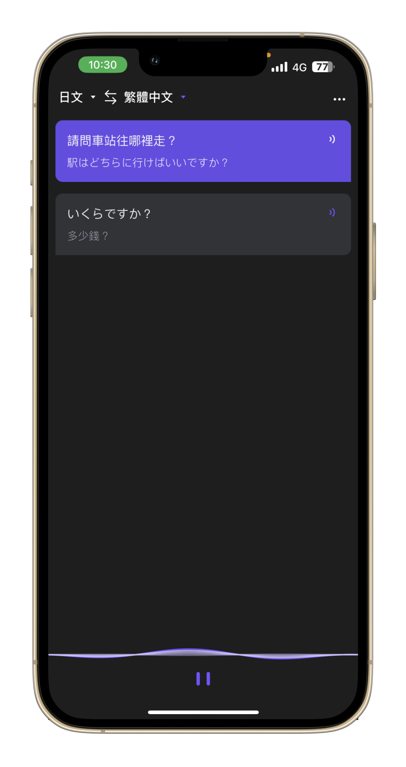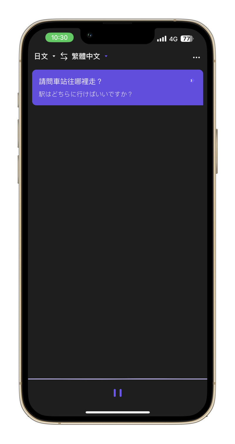 設定好後,直接開啟 App 就能使用,下方的語言辨識是自動開始,你自己按暫停才會間斷,不然是可以一句一句的連續對話,你可以對翻譯結果出來才繼續下一句,我想這對旅遊使用應該是非常方便了。