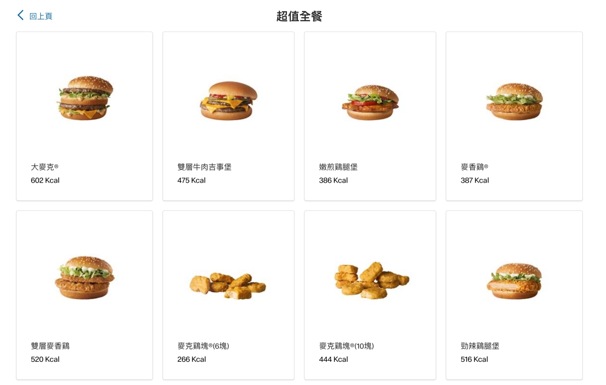 比如點擊超值全餐,這邊可以看到超值全餐的各種熱量。