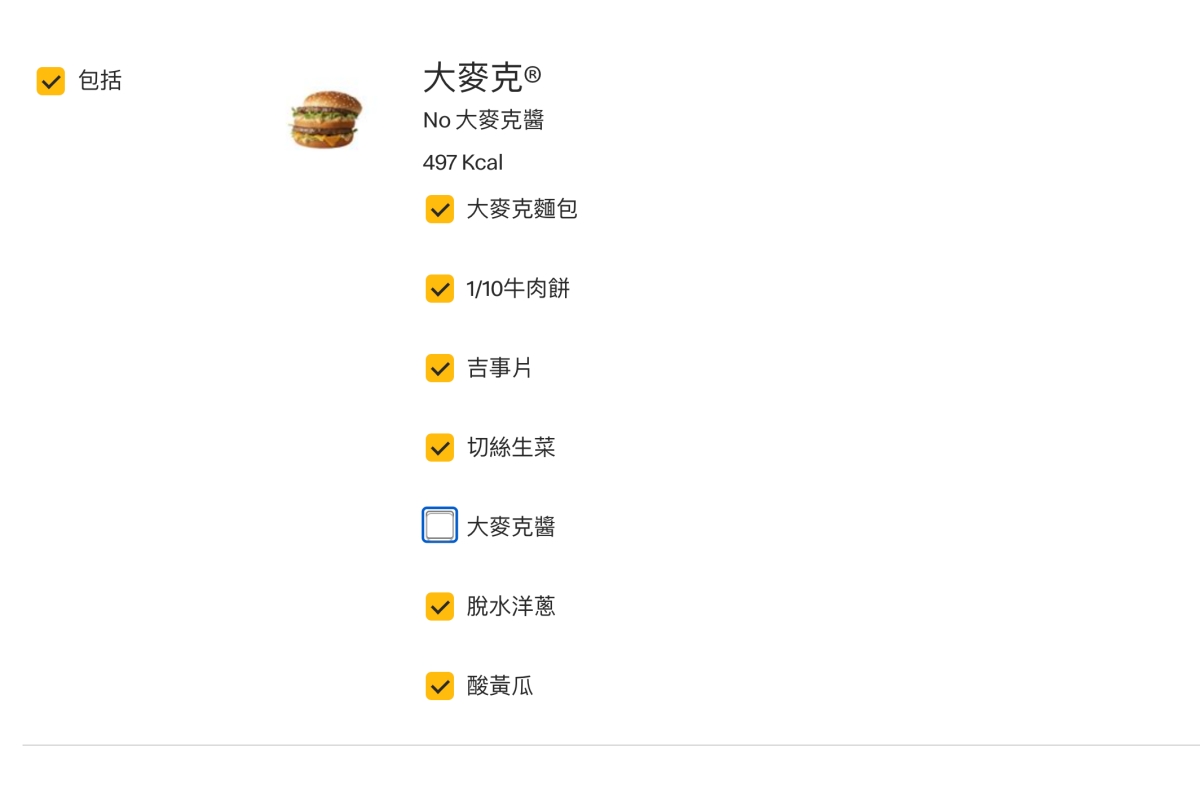 這計算機還有一個好處,當你覺得想吃的東西熱量高,但又不想換別的話,不妨可以點開後方的客製化產品,這時你可以看到整個餐點的組成,這時你可以各別的去取消勾選單一配料,就能看到去掉後的熱量是多少。