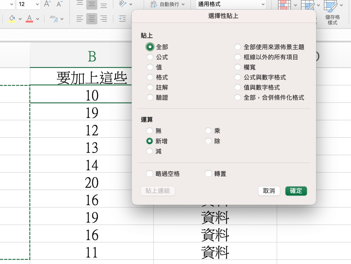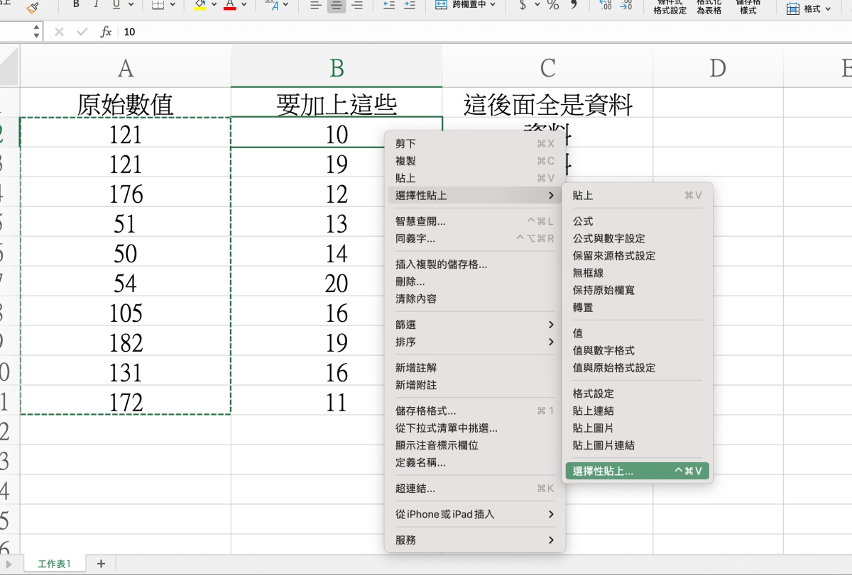 然後在 B 欄第一個加數右鍵,選擇性貼上 > 選擇性貼上。