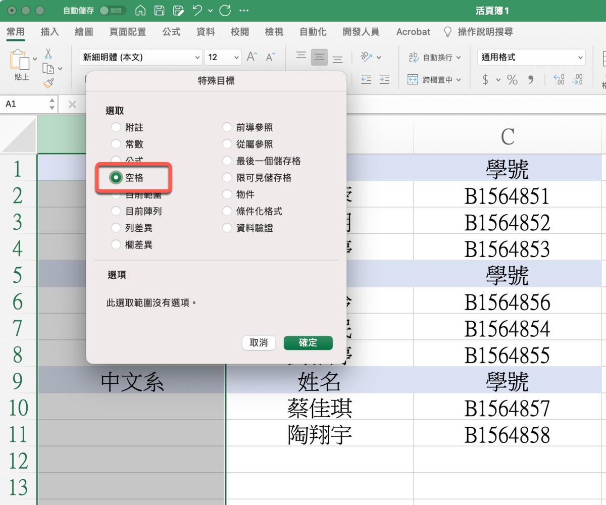 這時我們可以先選擇 A 列,你可以選整列也可以只選資料範圍,然後按下 Ctrl + G,進入「特殊」。