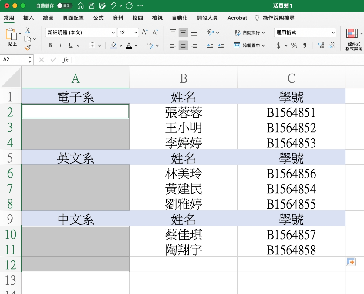 首先給大家看一下需求長怎樣,就像空白欄位一樣,我們要電子系下先填入 1.2.3 後,在英文系下一樣 1.2.3 這樣,每個類別都會從 1 開始填入。