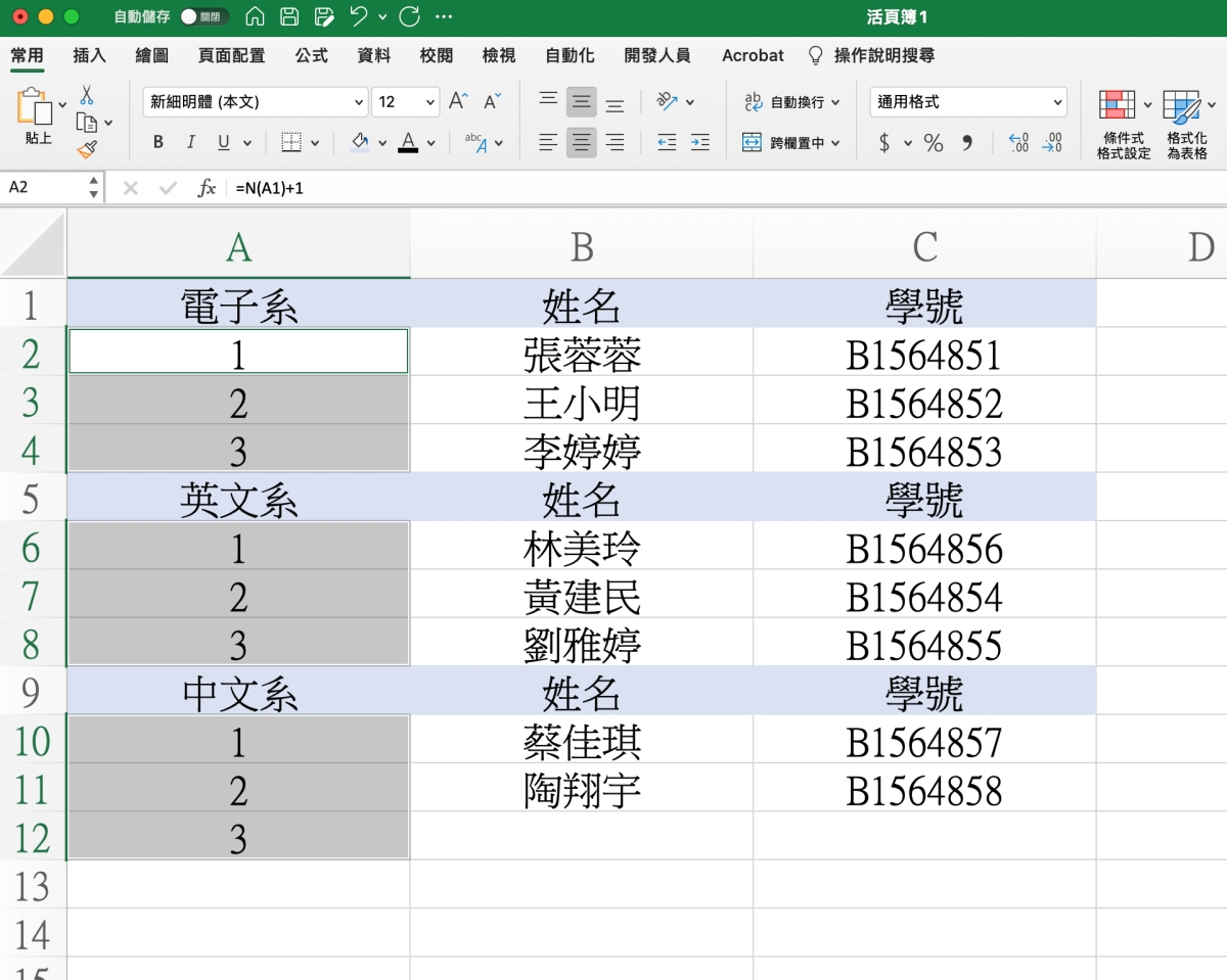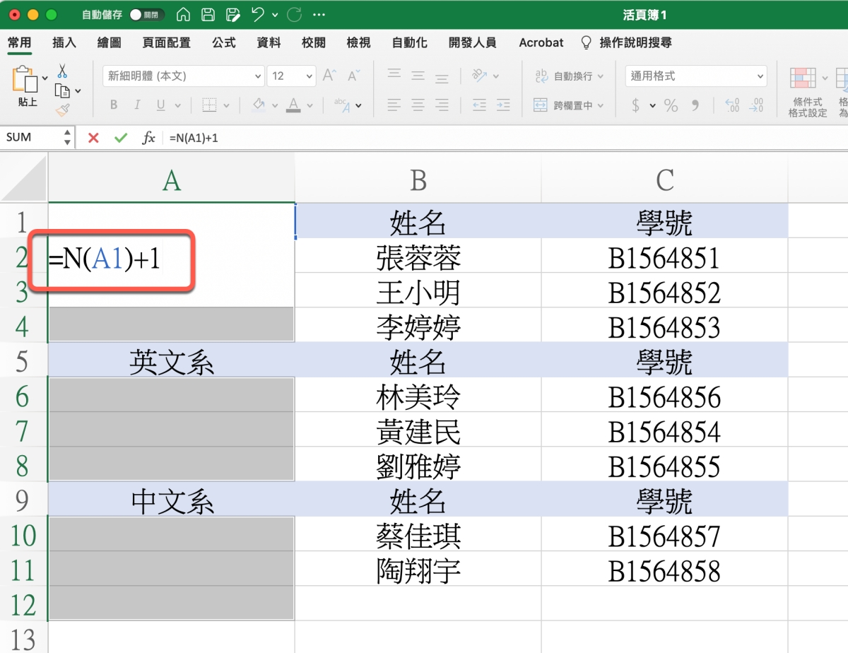 這邊說明一下,A1 是指你第一個標題欄位,而 N 是一個函數,大家可以查看「這裡」看詳細用法,我大概說明一下基本的,參數內如果是文字的話,會顯示為 0,如果是數字就會傳回欄位內的數字,所以用他來 +1,就會依序填入 1.2.3,到下一個標題類別時,因為又判斷到文字,為 0,所以又會重新來過。