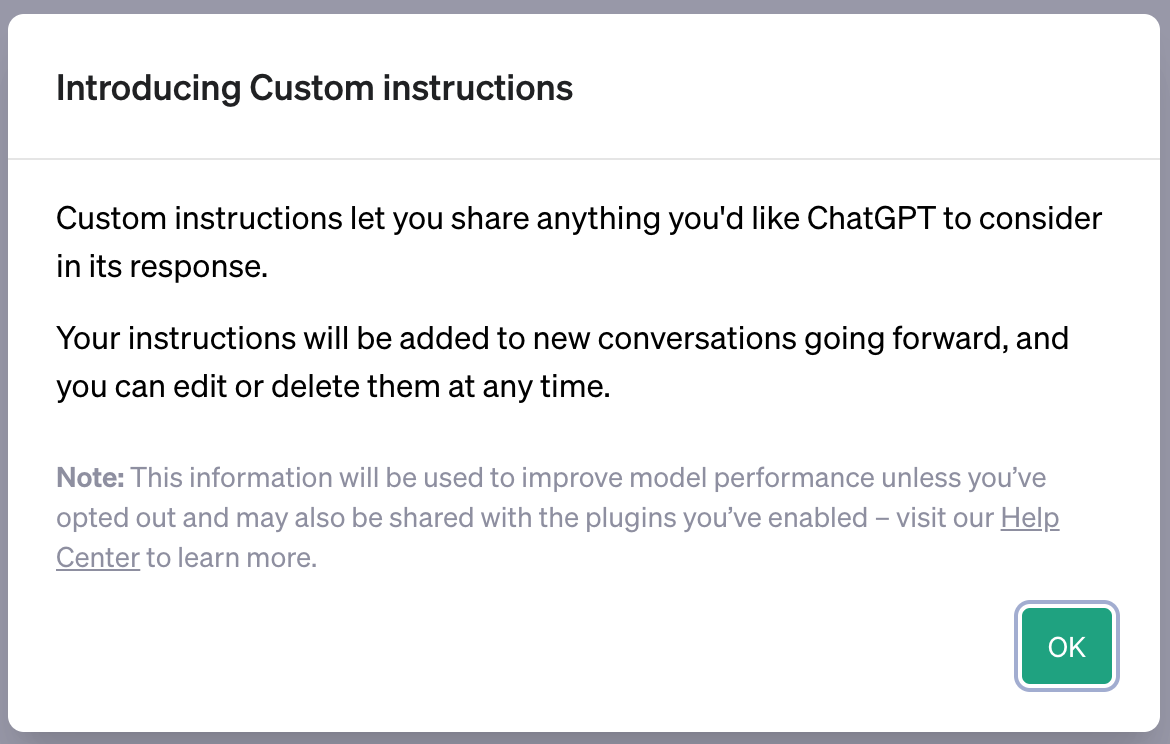 ChatGPT 更新的速度雖然似乎變慢,不過自從加入外掛功能後,真的是一路向北走不停,外掛的數量也愈來愈多,讓我們在使用 ChatGPT 變的更加便利,不過大家有發現一個問題嗎?有很多比較客製化或個性化的指令,如果你換了一個新的對話視窗就要重講一次,有點麻煩,這件事 ChatGPT 注意到了,為了讓 AI 更加符合你的需求,最近加入了「Custom instructions」自訂指令的功能,可以預先打入各種資訊及預設指令,讓 ChatGPT 變的更像你專屬的 AI 機器人!