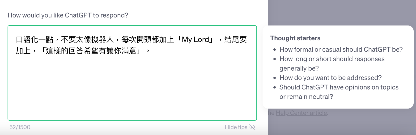 而第二個欄位是填寫你希望的回答方式,你可以讓他加上什麼名稱,或是結尾怎麼回答,或者像程式設計師可能會希望他回答程式時,只給答案,不用說明,也可以在這裡加進去,這樣回答會更貼進你的需求,減少你每次重複下指令的麻煩。