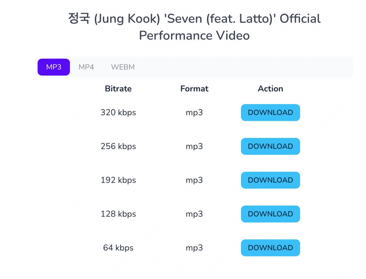 進入分析完成後,就會在下方分別提供 MP3、MP4 以及 WEBM 格式的檔案可以下載,MP3 如同前面提到的,最高支援下載 320kbps 的高音質檔案,我下載後確實也是 320kbps 無誤。