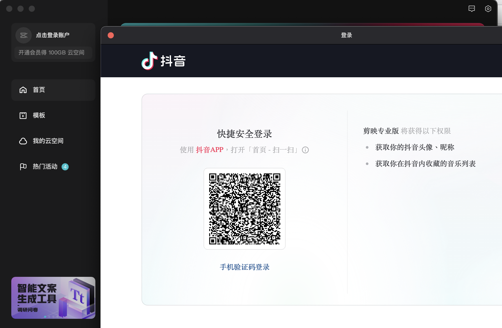 去掃描電腦版的剪映專業版進行登入使用,mac 版有時掃一次沒反應,你可以再掃一次就能登入。