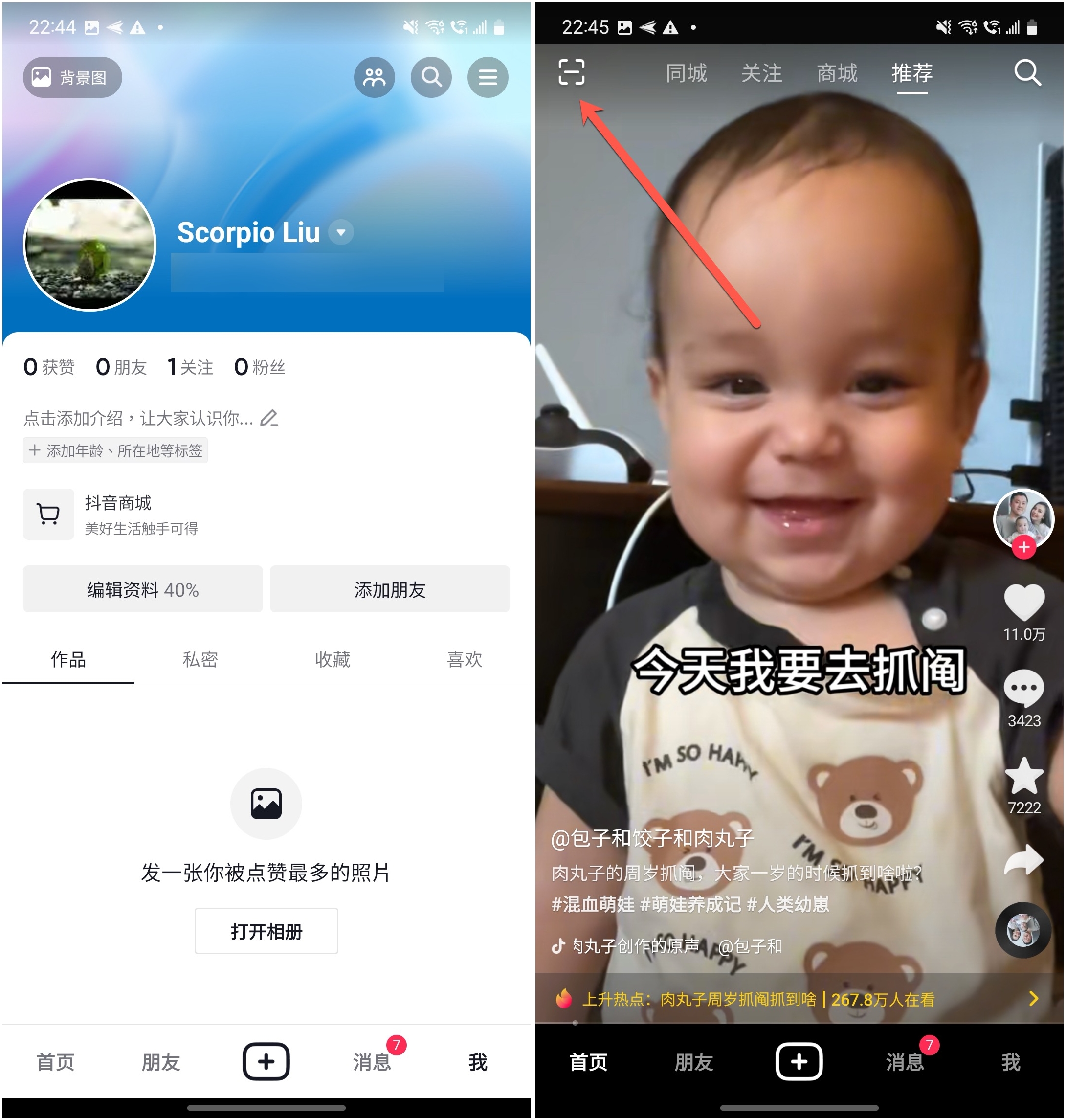 然後就成功登入中國版的抖音囉,接下來可以到首頁按左上角的掃描,不過說真的,規則一直在改,一切都是運氣,祝大家幸運成功。