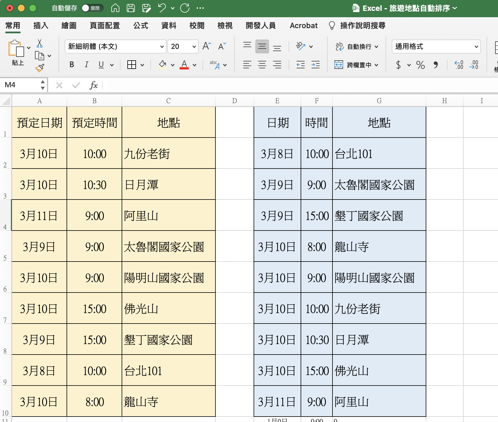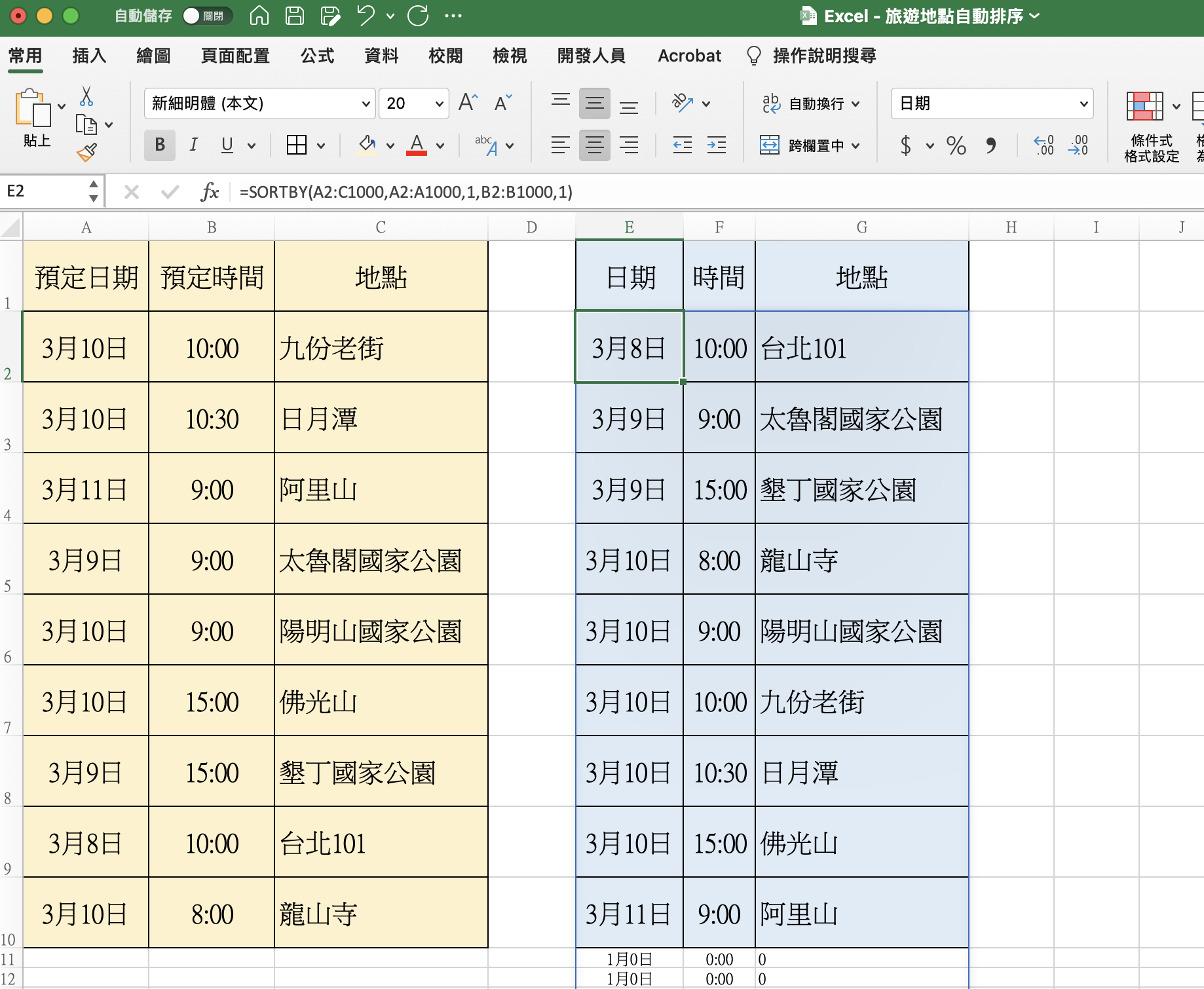 Excel 教學 - 自動將旅遊行程按時間順序排列