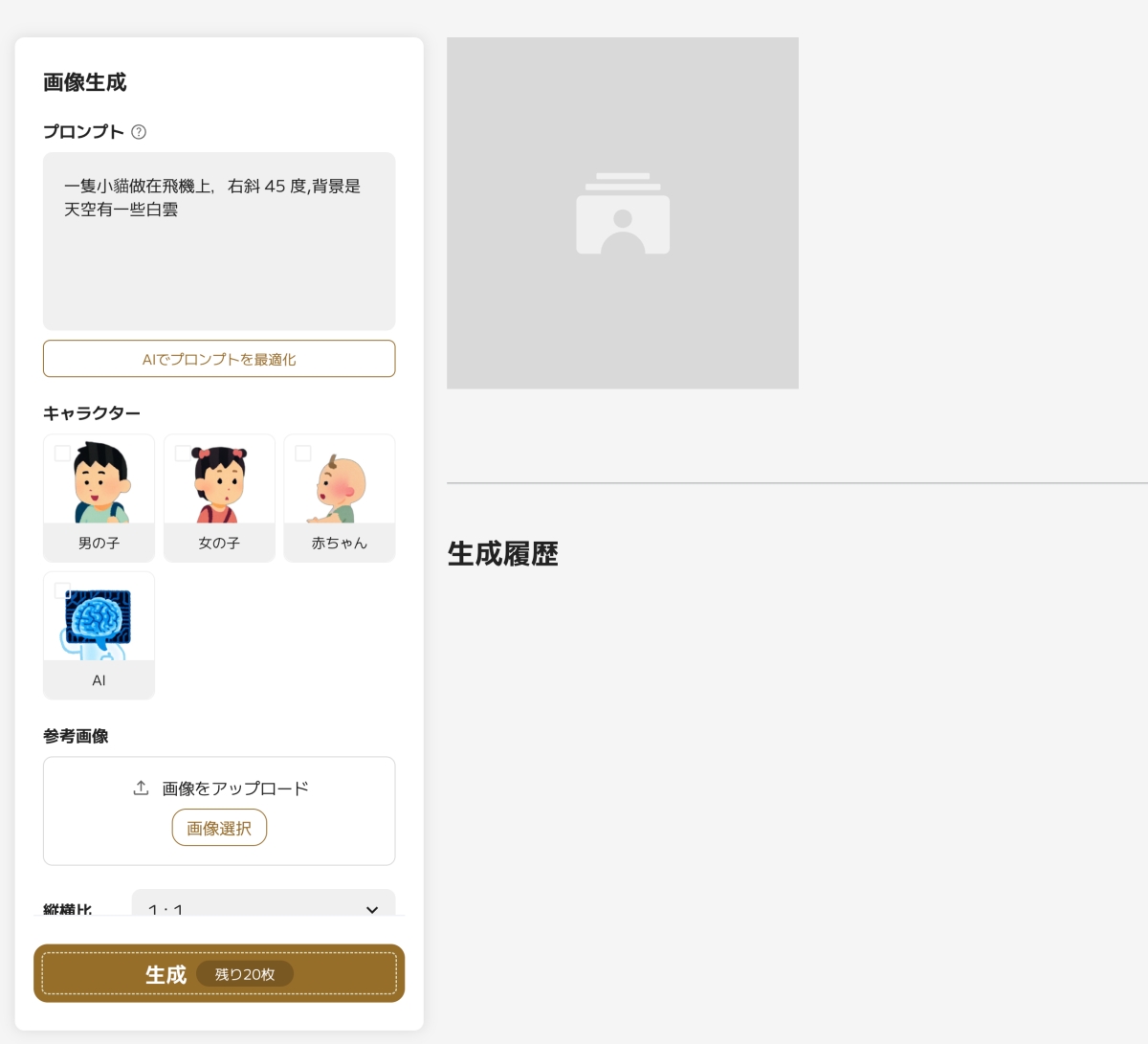 輸入完後會跳到這畫面,你也可以點擊 AI xxxx 最適化後讓他幫你再優化一下你的描述,或是像中文會翻譯成英文,下方還有還有一些相關設定,比如可以自行匯入參考圖等。